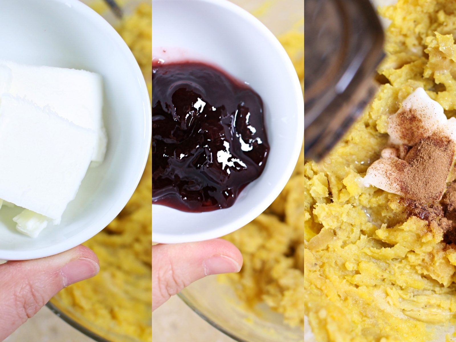 으깬 고구마에 버터2큰술, 잼2큰술, 시나몬가루2큰술을 넣어요.