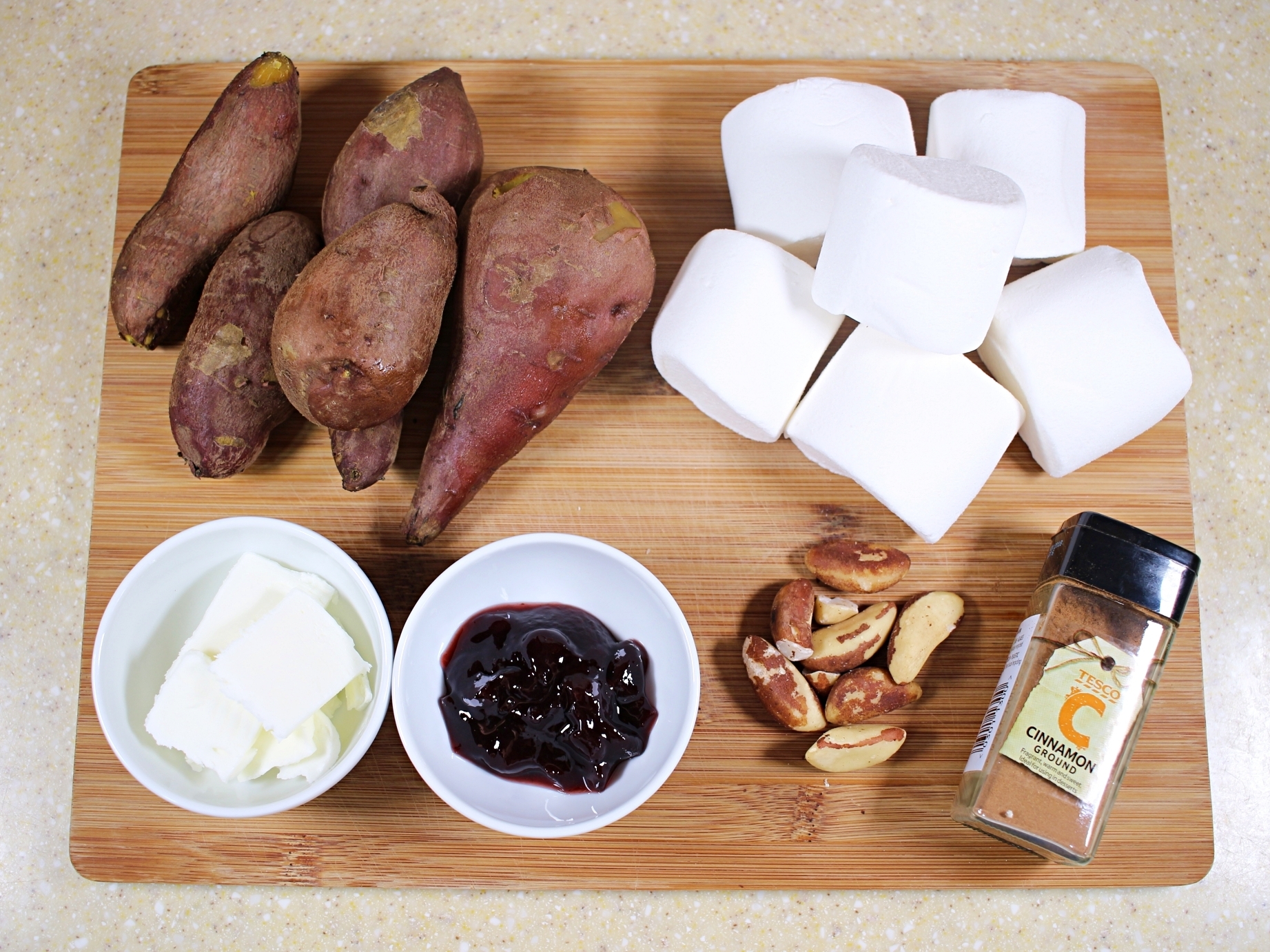 재료는 고구마, 마시멜로, 버터, 잼, 견과류, 시나몬가루 준비했어요.