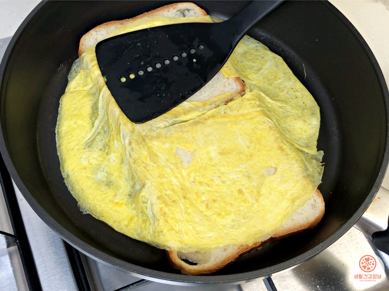 식빵과 달걀이 떨어지지 않게 한번에 뒤집어 주시고요.