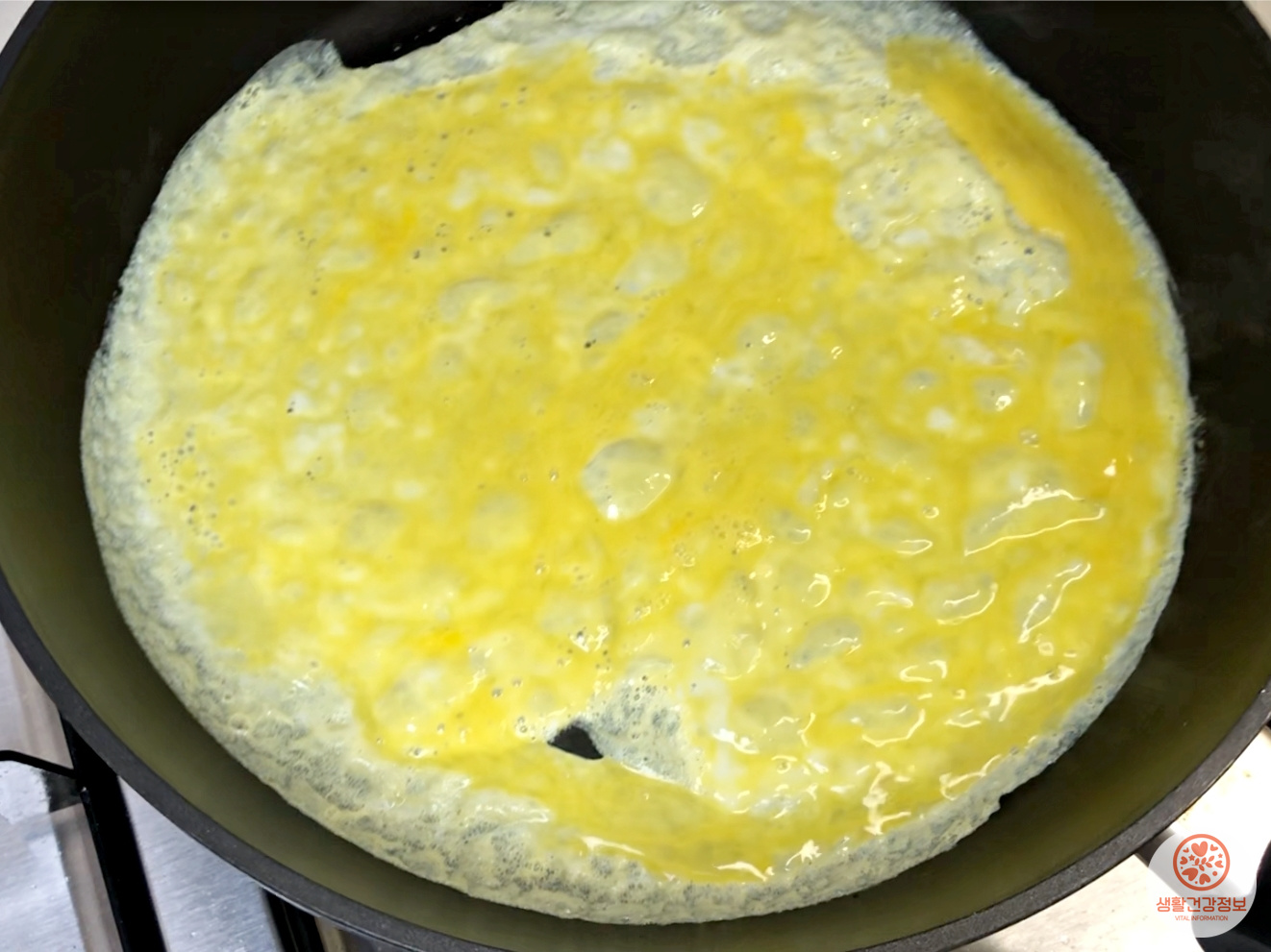 뒤집어서 후라이팬 가장자리에 놓아주세요.