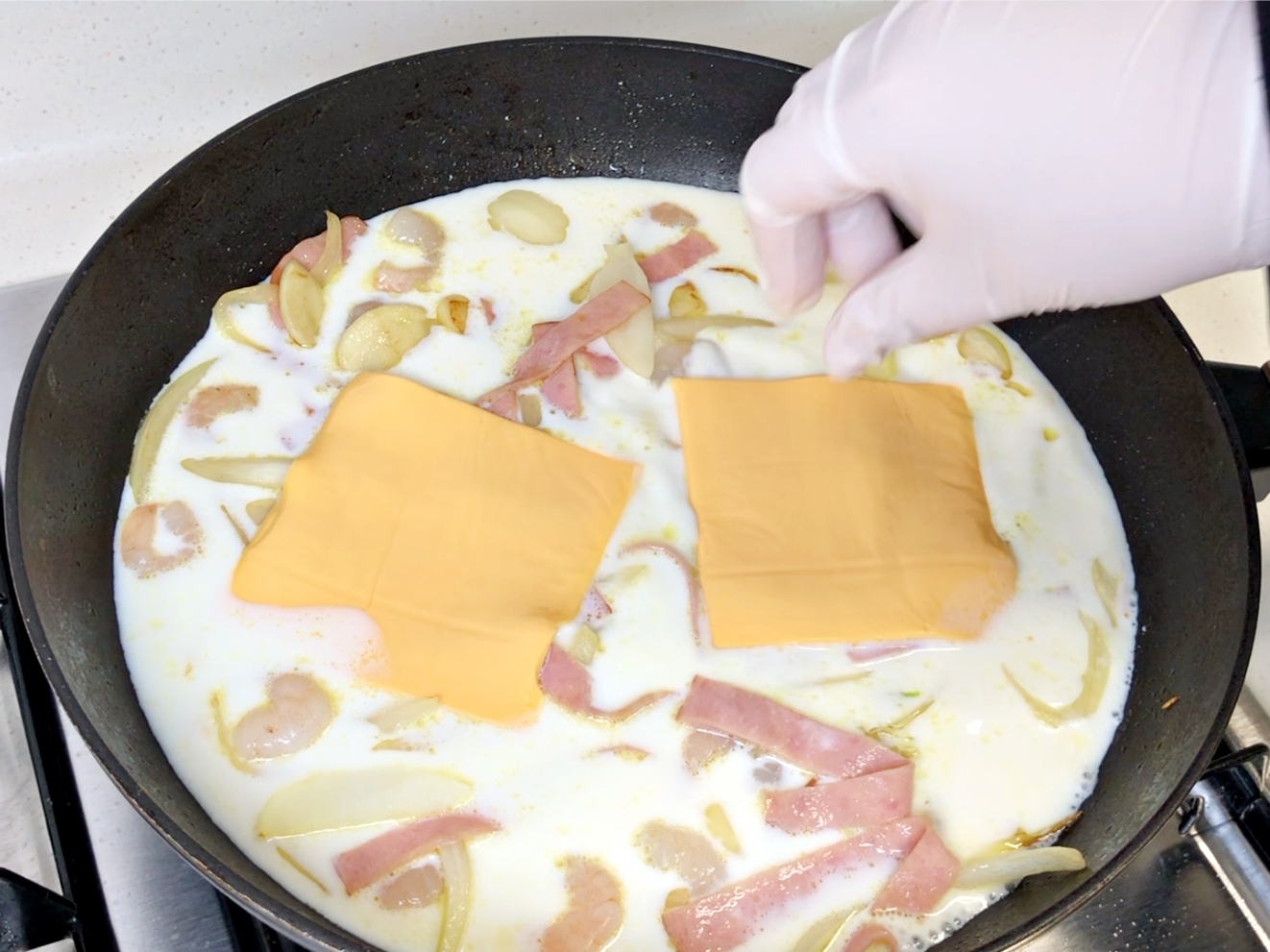 신라면, 새우, 우유, 슬라이스치즈, 햄, 양파, 새우.