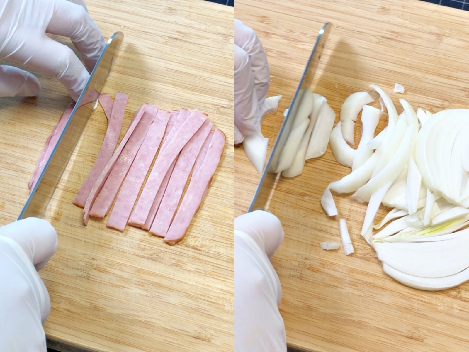 양파가 투명하게 변할 때쯤 햄이랑 새우도 넣고 볶아주세요.
