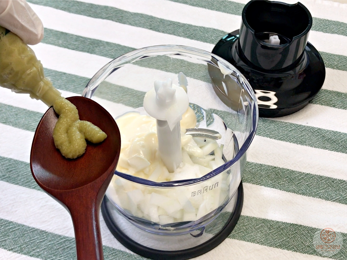 재료는 마요네즈, 양파, 설탕, 고추냉이 준비했어요.