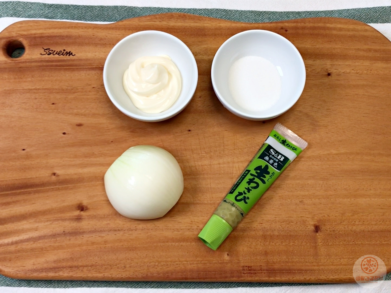 재료는 마요네즈, 양파, 설탕, 고추냉이 준비했어요.