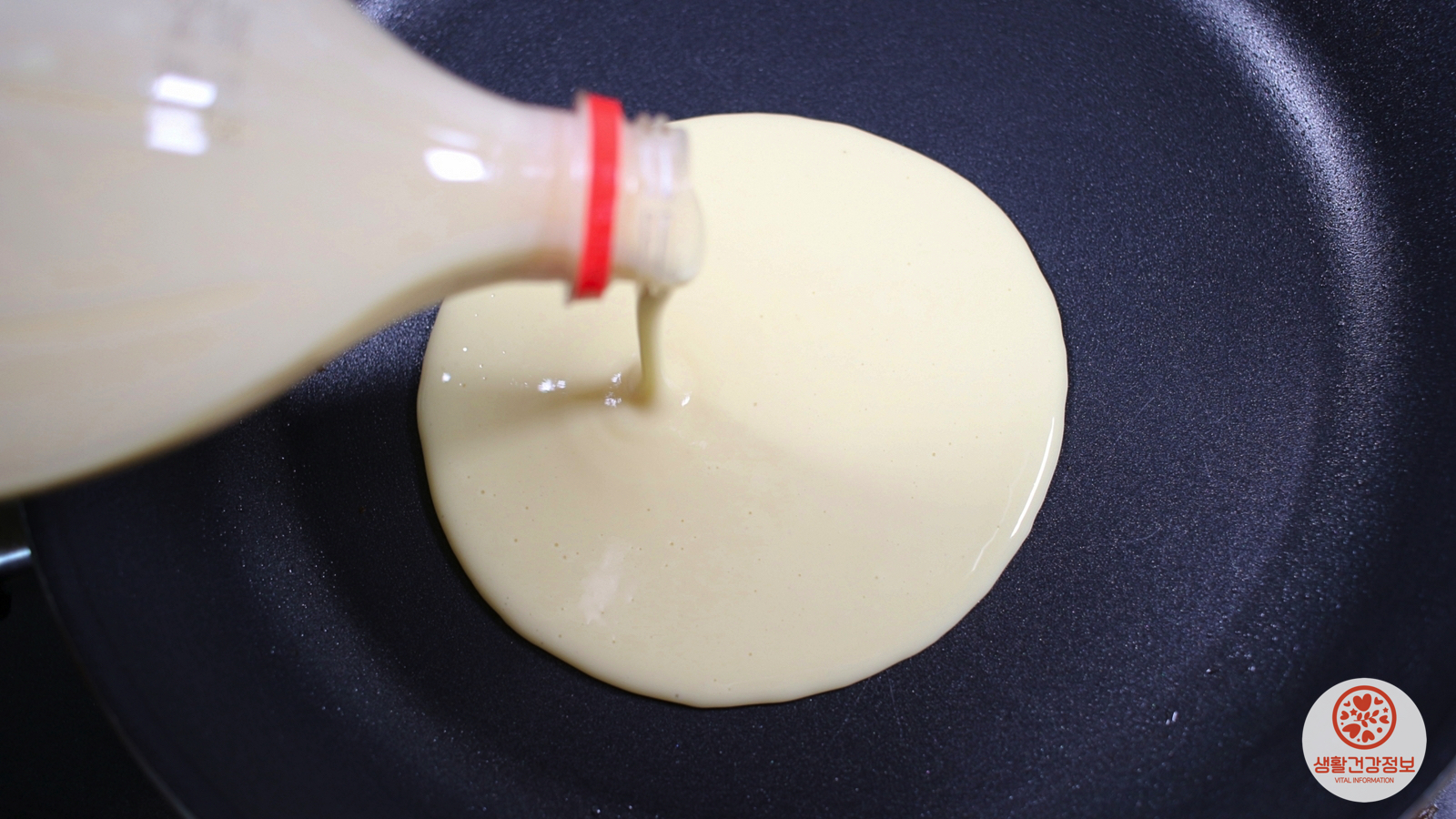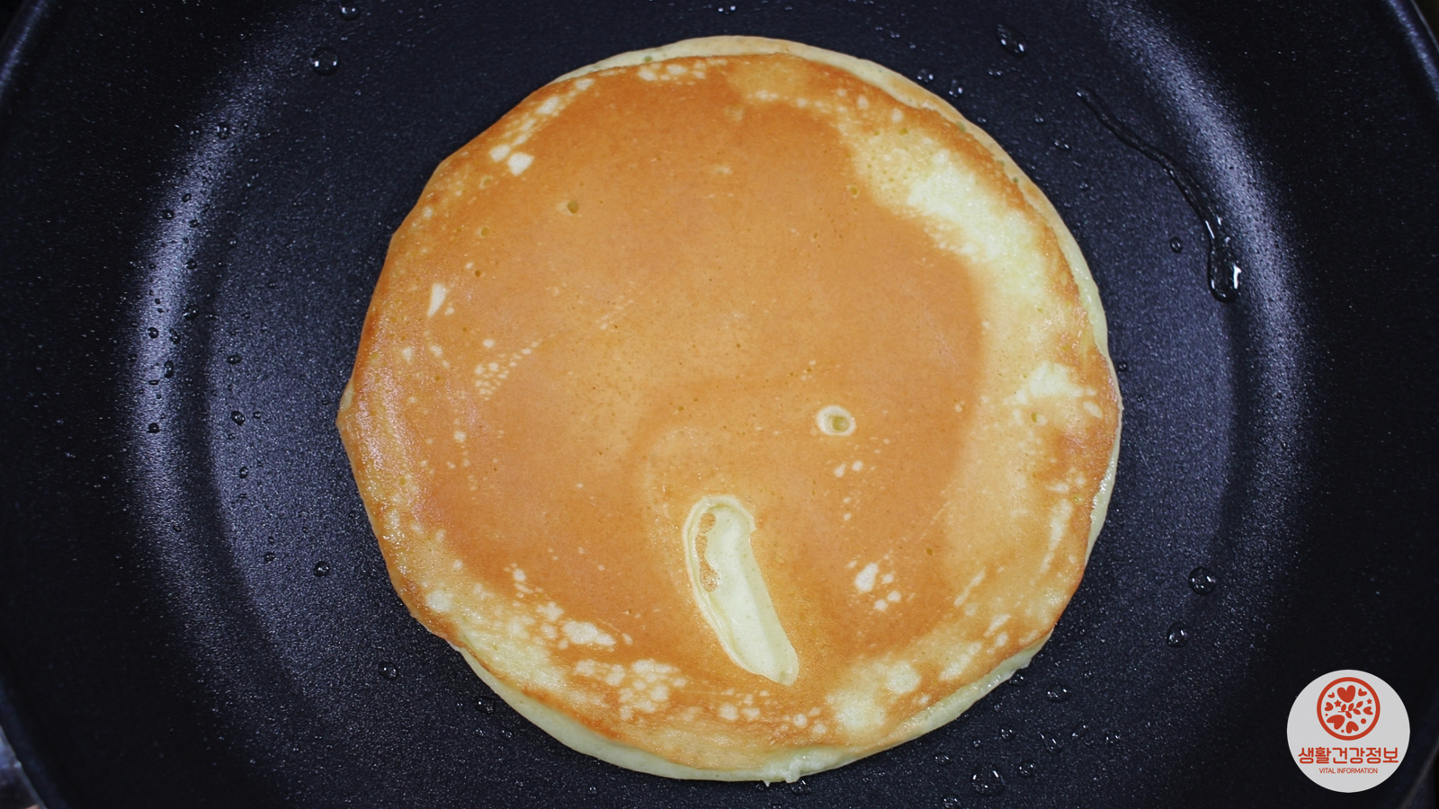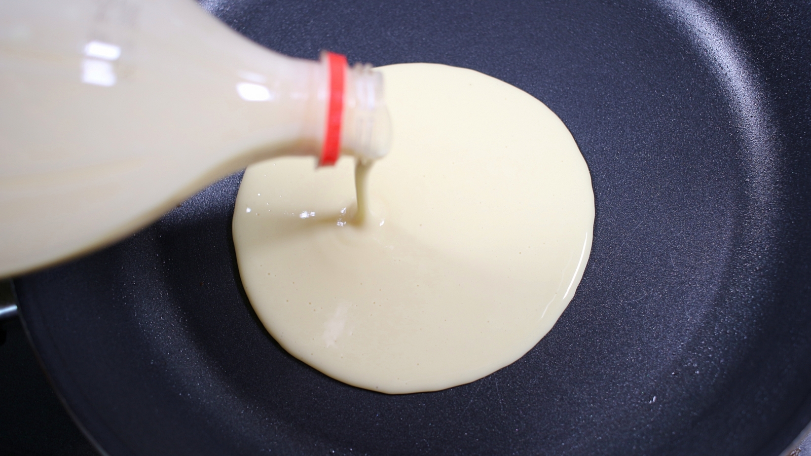 프라이팬에 그대로 부어서 팬케이크를 만들어요.
