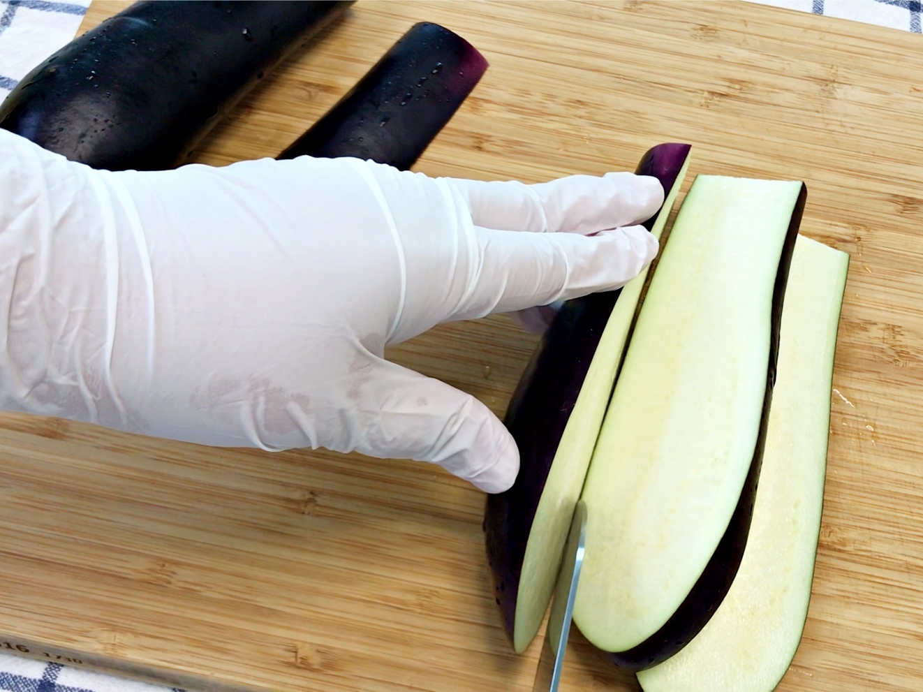 가지는 깨끗이 씻어 0.5cm두께로 길게 썰어주세요.
