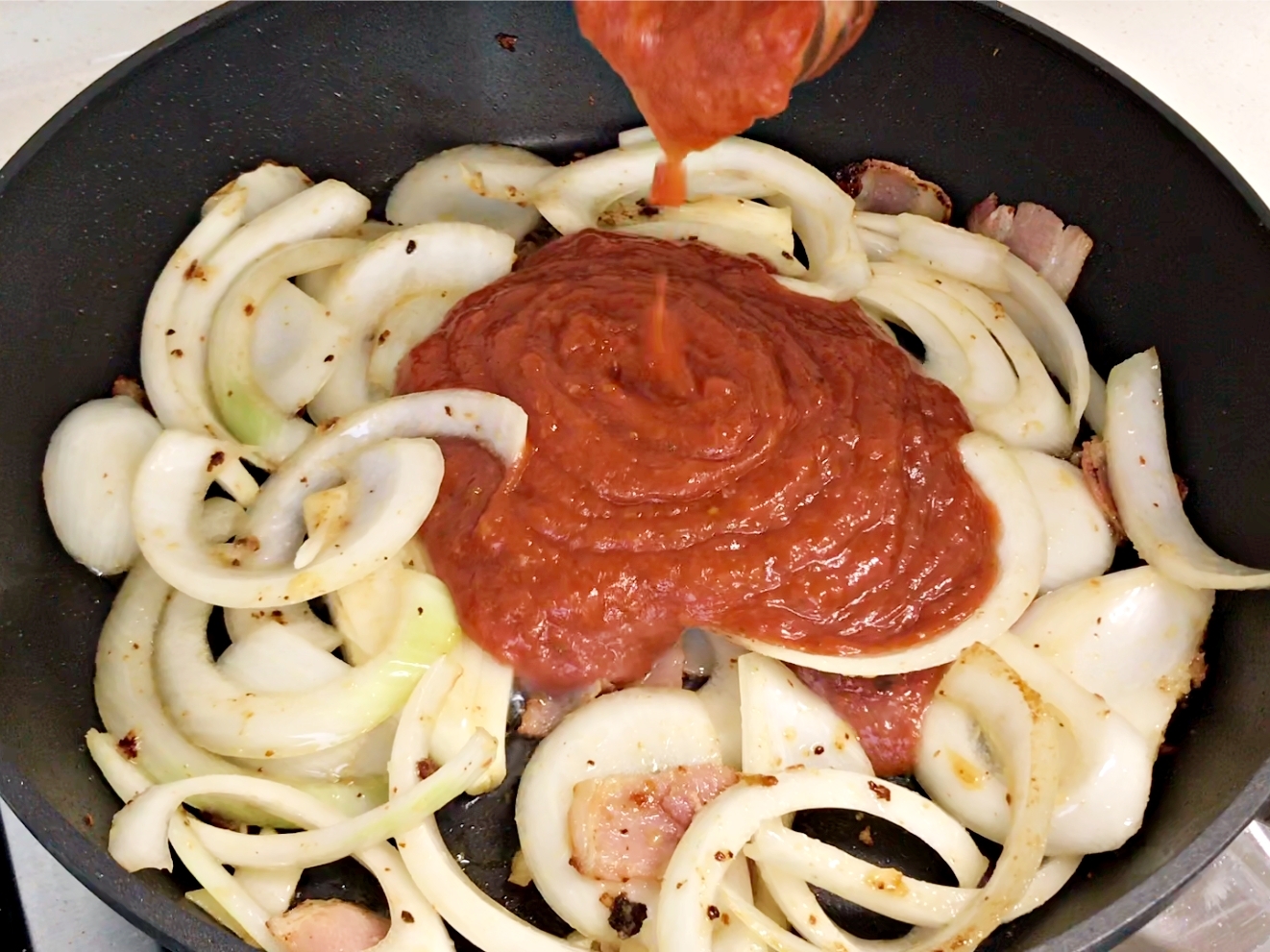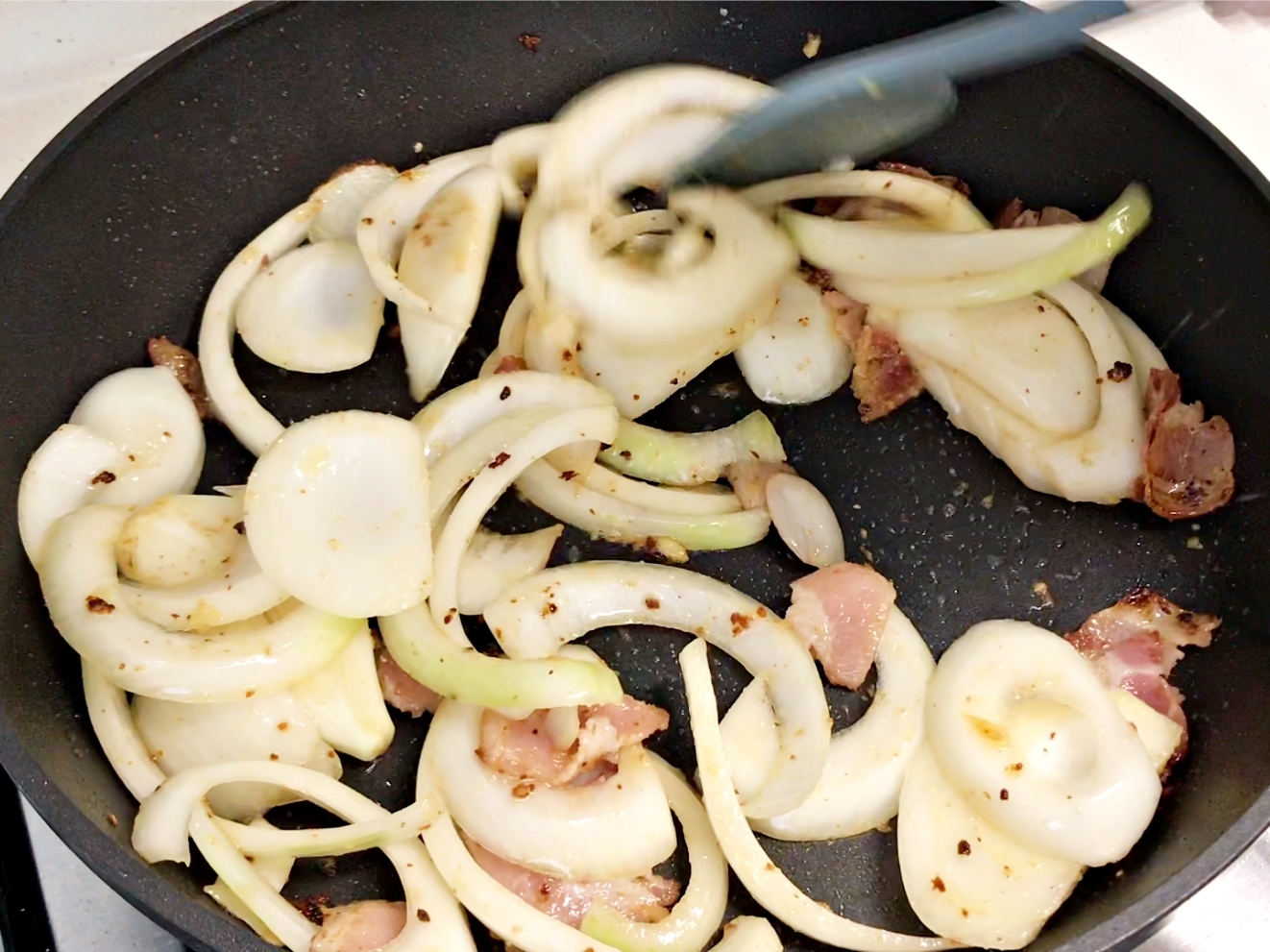 마늘향이 올라오면 채 썬 양파와 베이컨을 넣고 볶아주세요.
