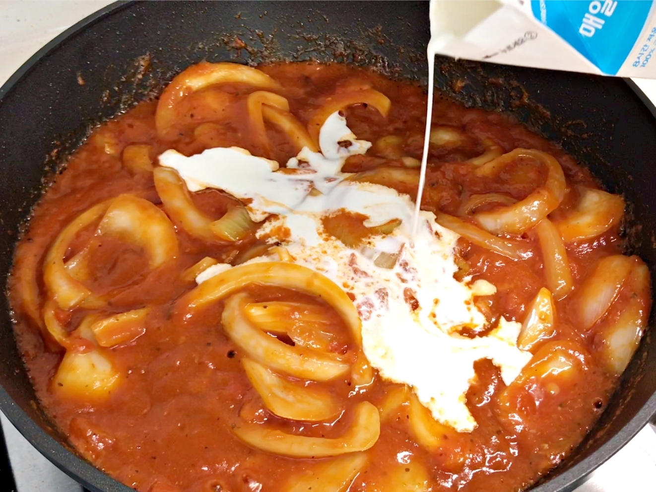 토마토소스를 넣고 약간의 생크림도 추가해요.