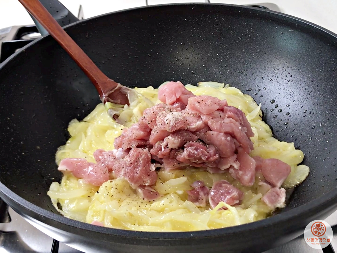 아주 부드럽게 볶아지면 고기를 넣어주세요.