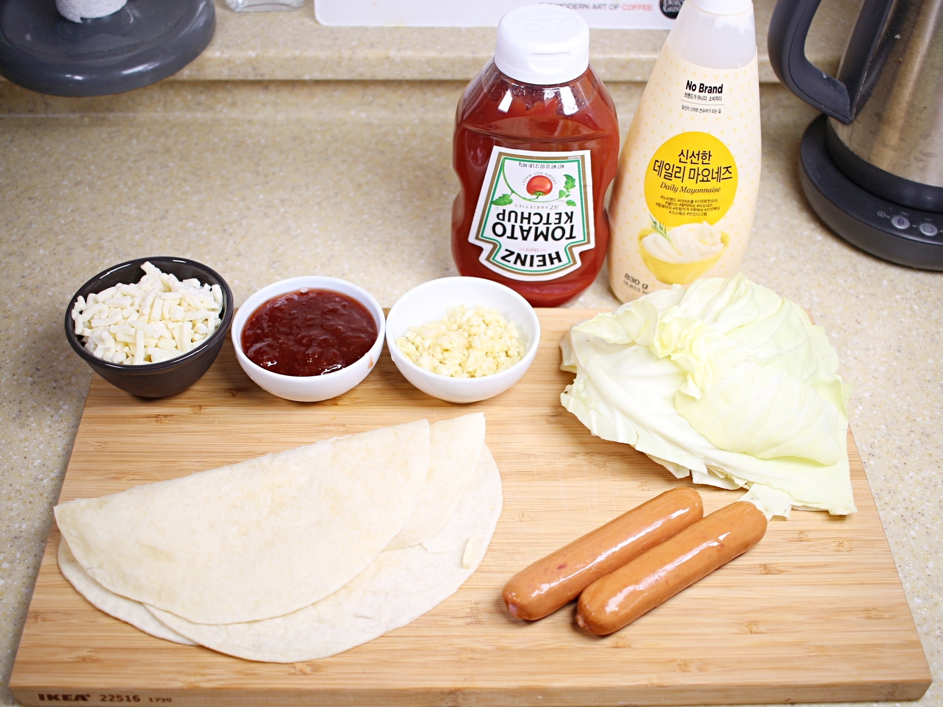 재료는 양배추, 또띠아, 소시지, 모짜렐라치즈,