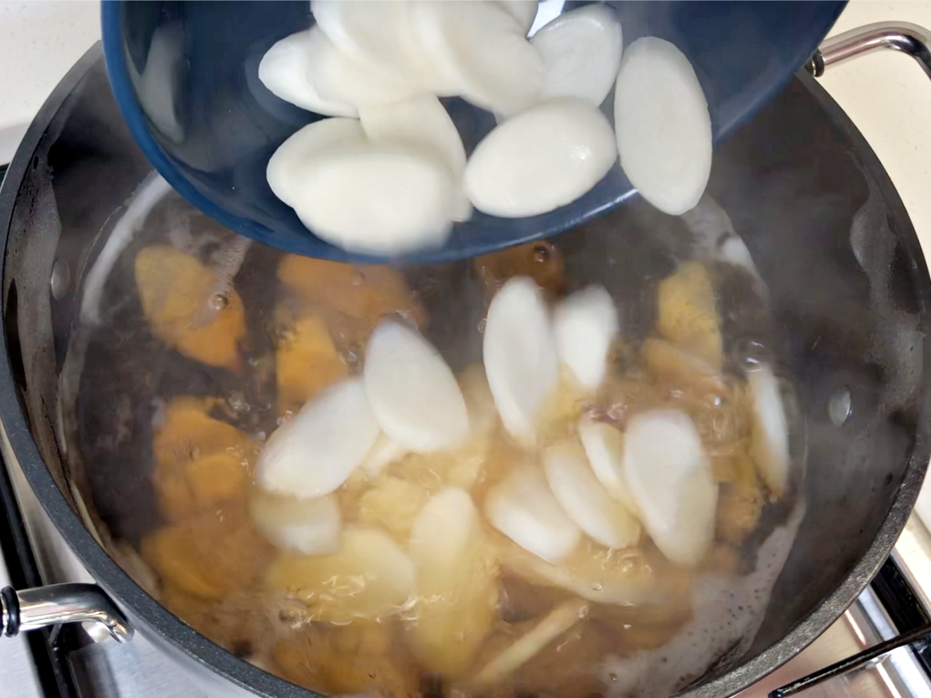 여기에 떡국떡을 폭 담가주세요.