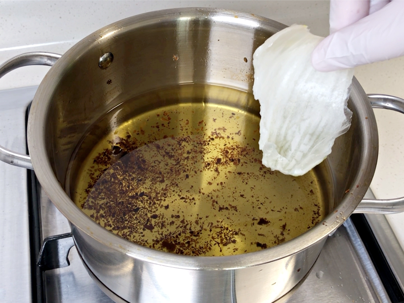 기름이 식으면 체에 걸러서 불순물을 제거하고