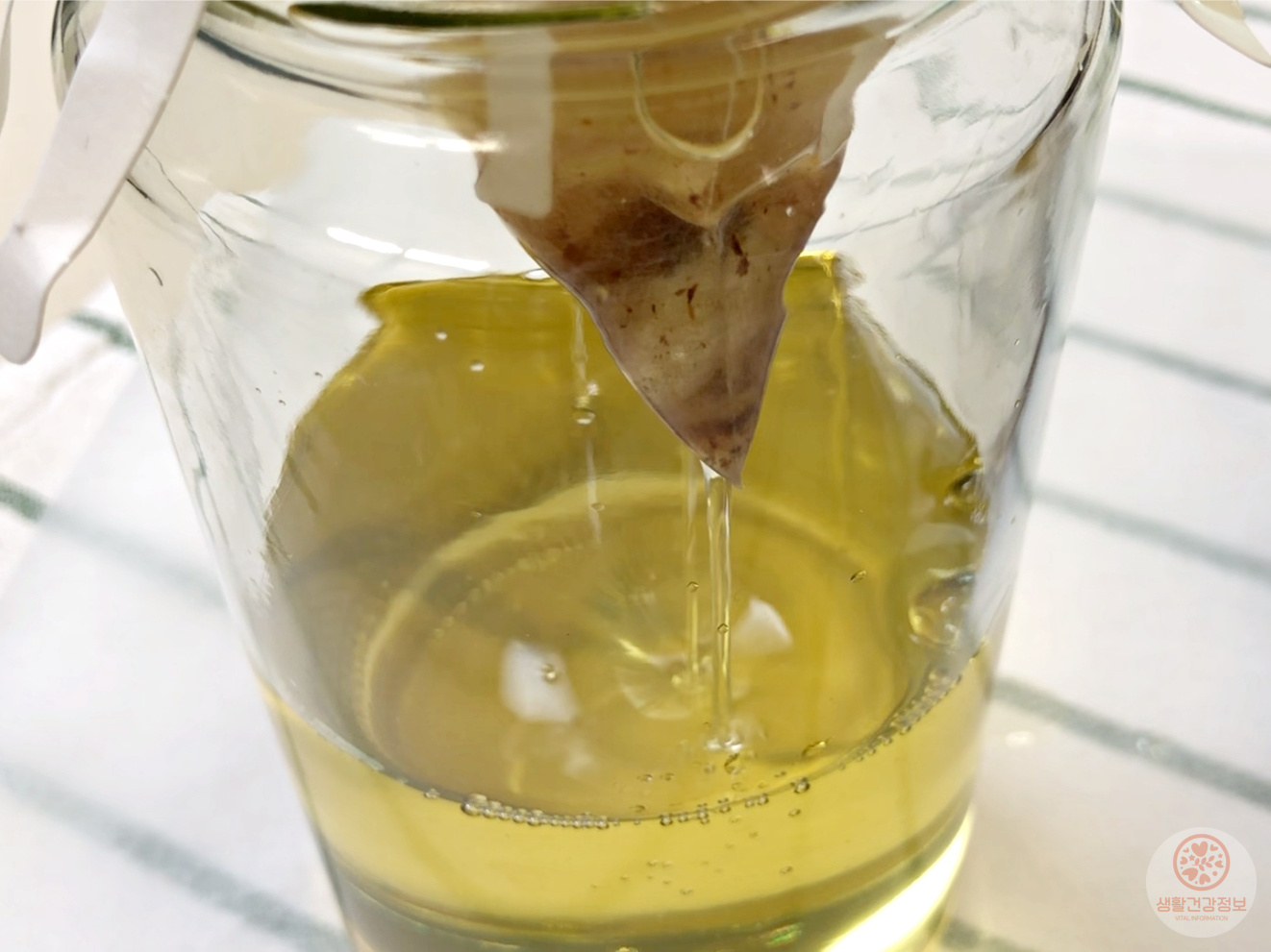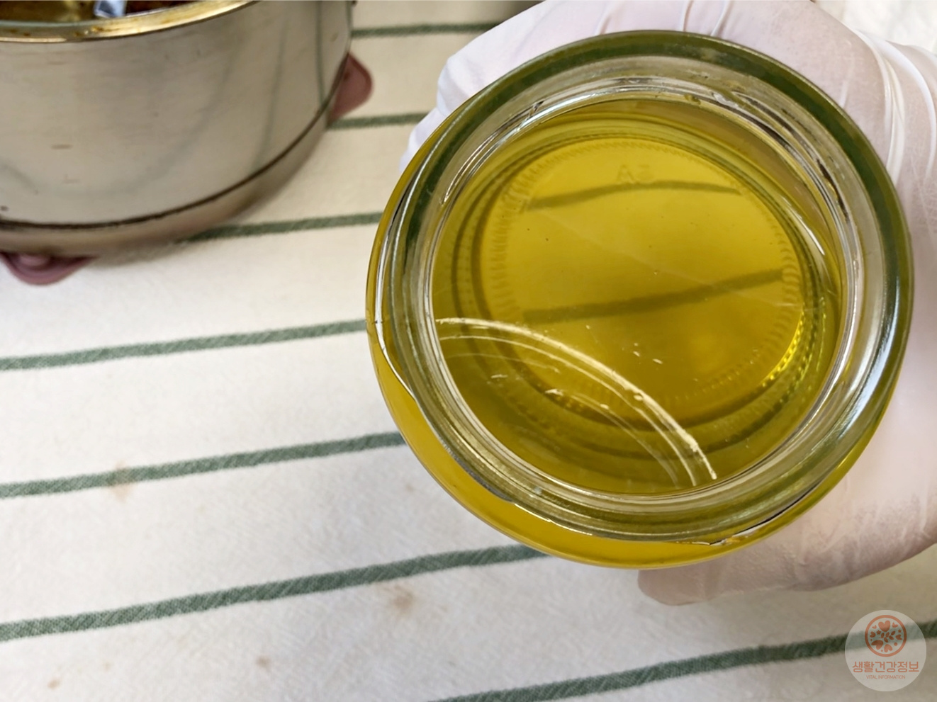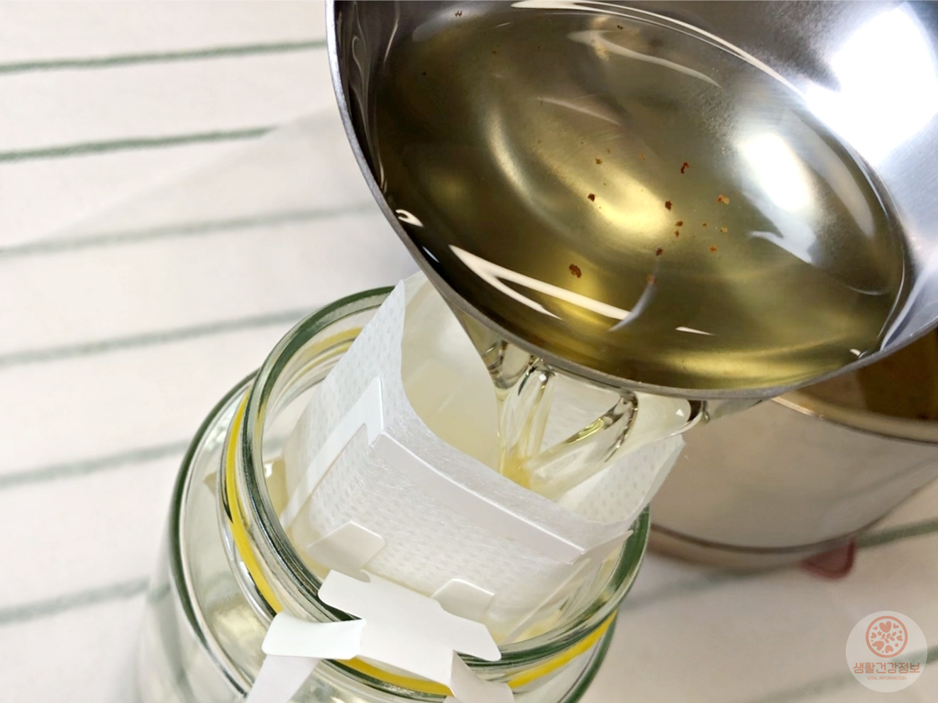 기름이 식으면 체에 걸러서 불순물을 제거하고