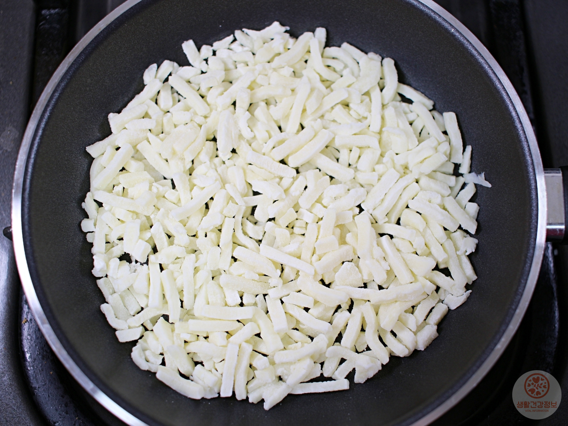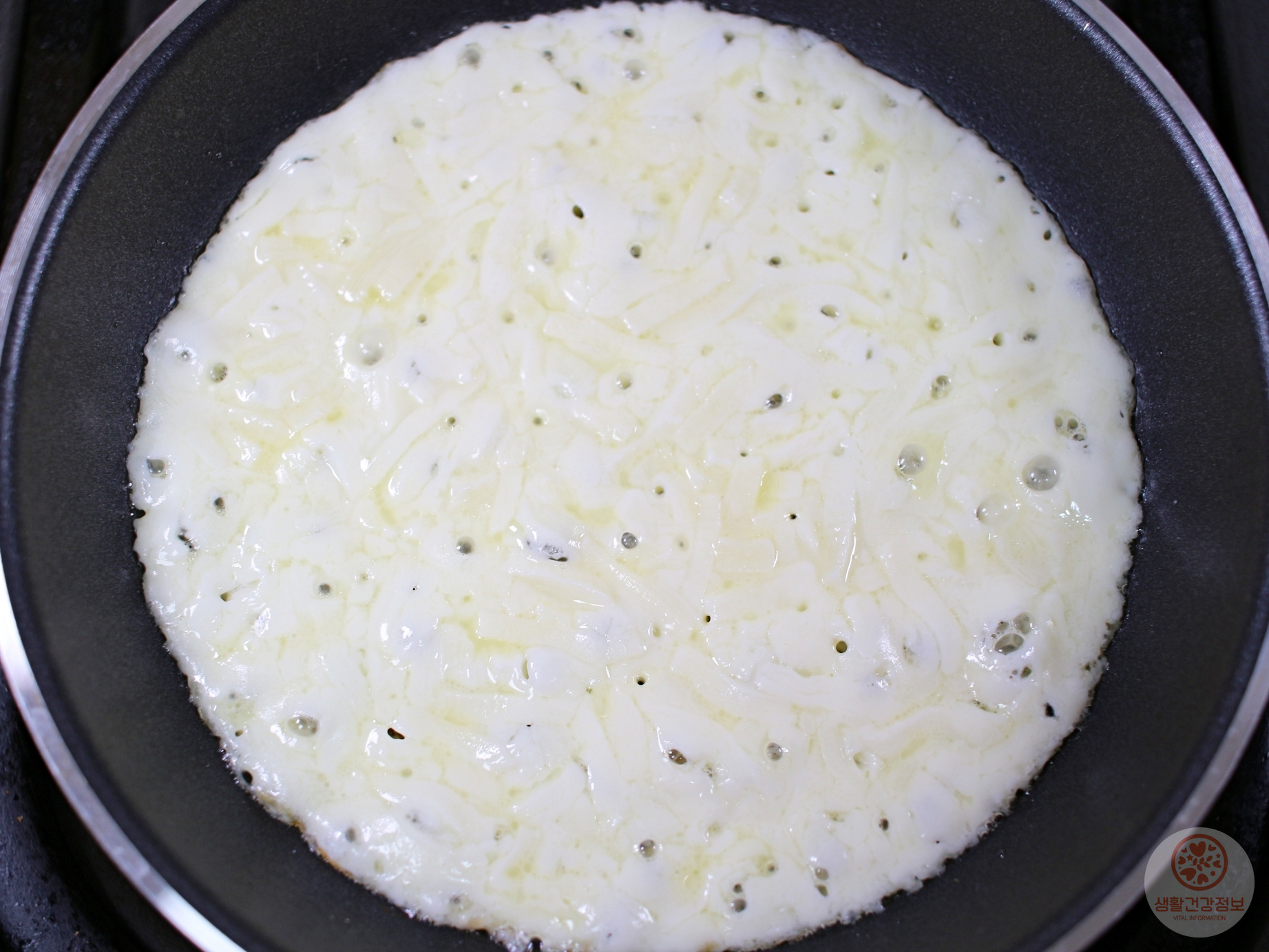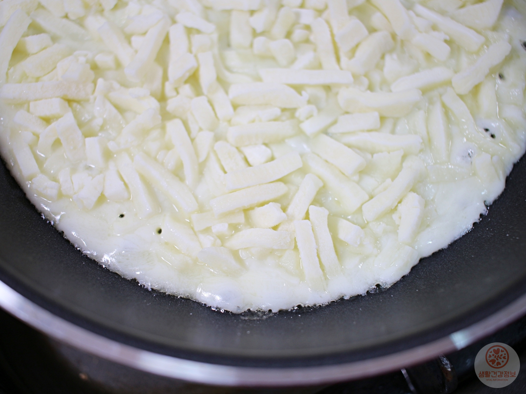후라이팬 바닥에 모짜렐라치즈를 빈틈없이 펼쳐주세요.