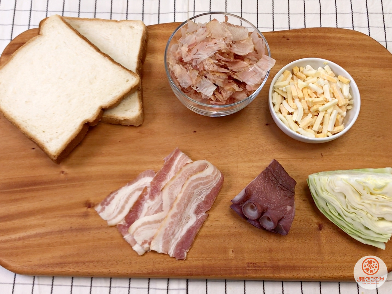 재료는 식빵, 치즈, 베이컨, 문어, 양배추 그리고 가쓰오부시