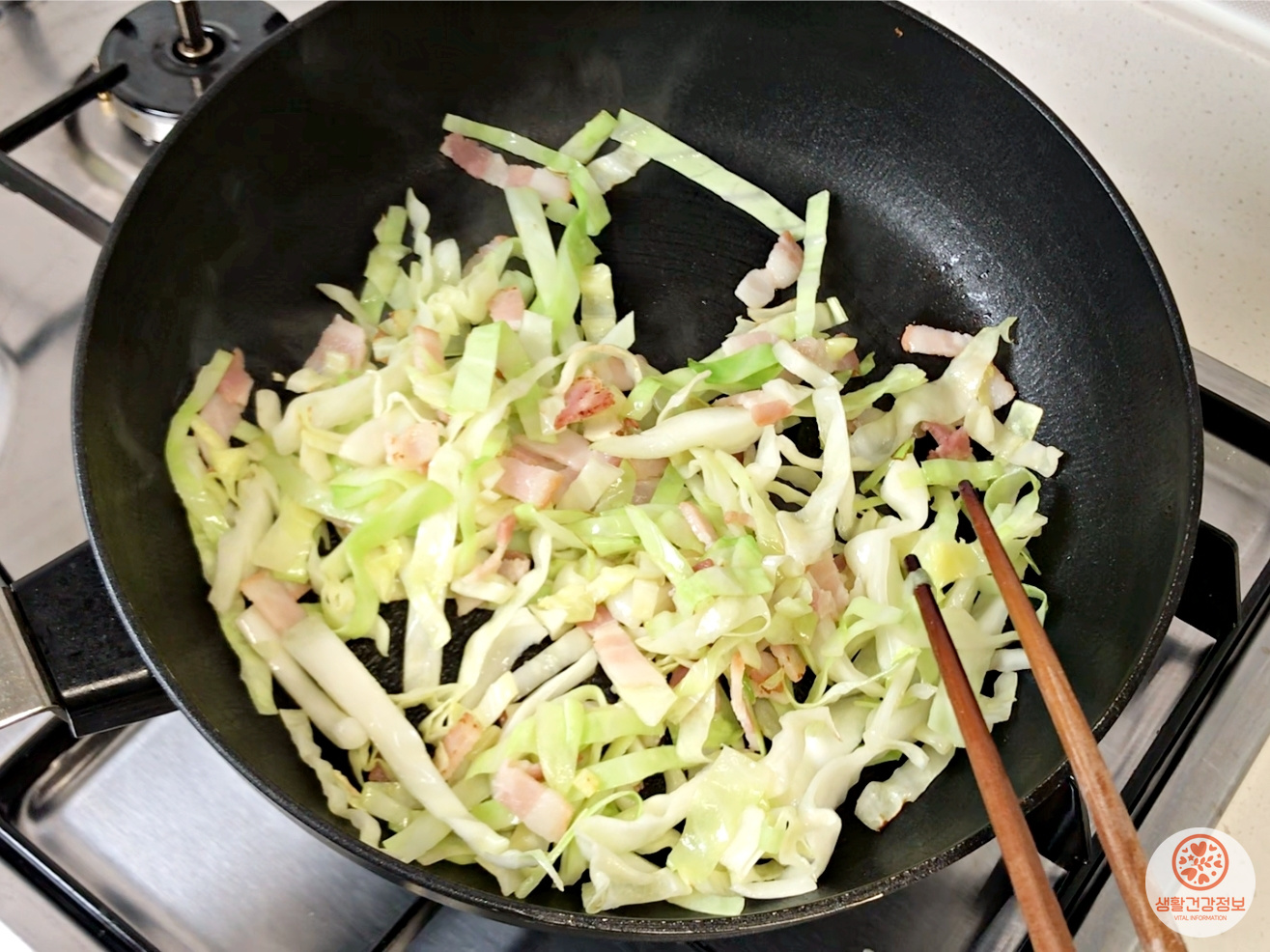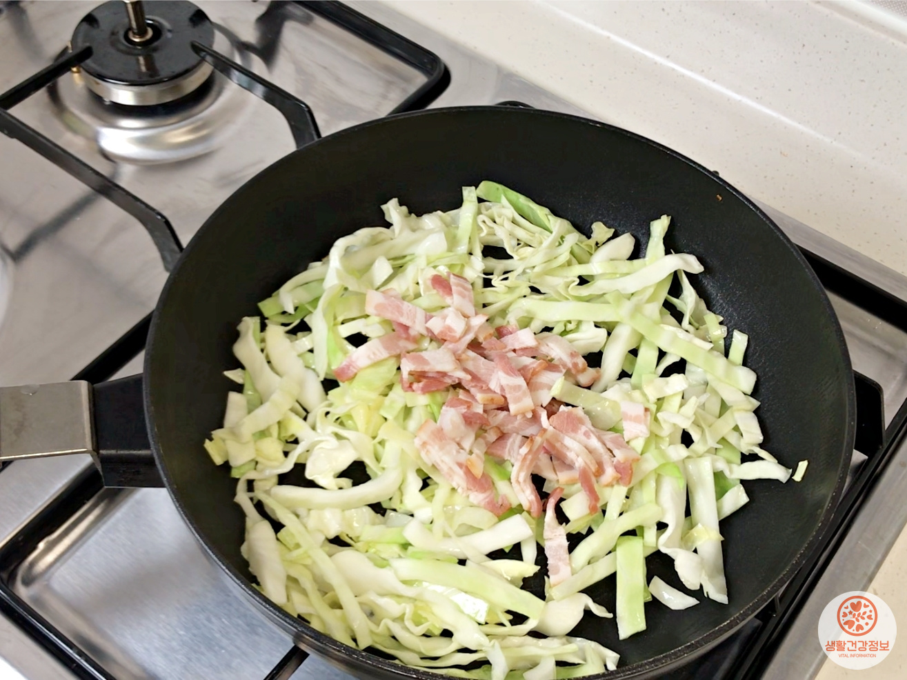 양배추가 투명하게 익으면 베이컨을 넣어서 볶아주세요.