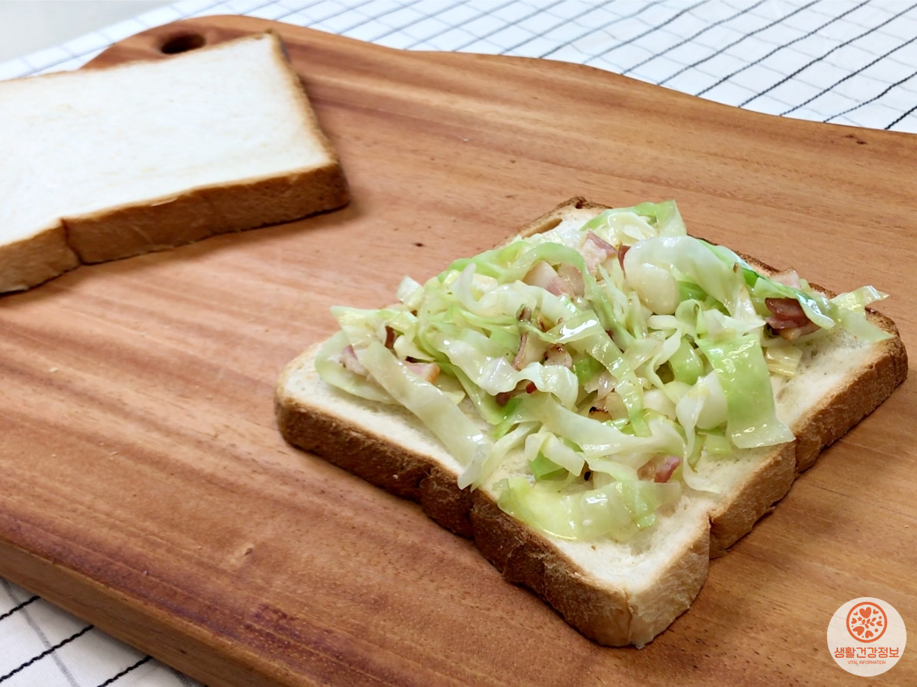 식빵 위에 볶은 양배추랑 베이컨 올리고