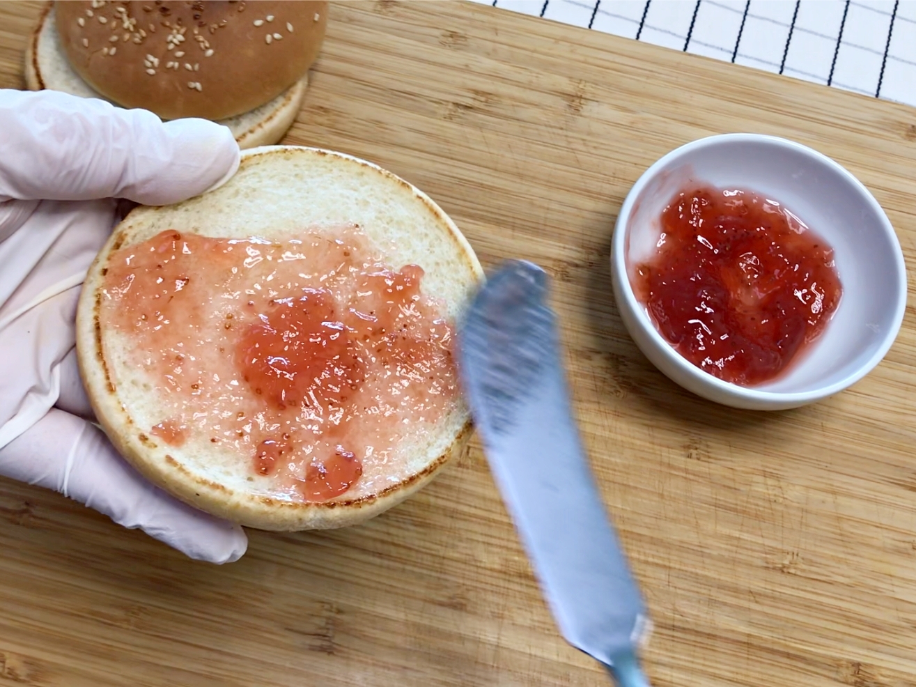 빵 한쪽면에 딸기잼을 바르고