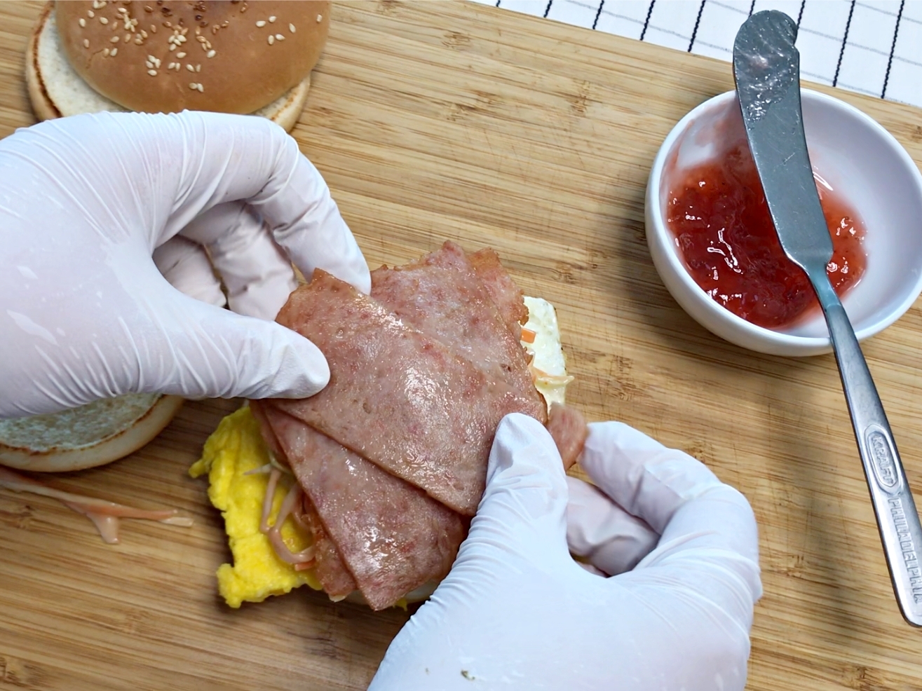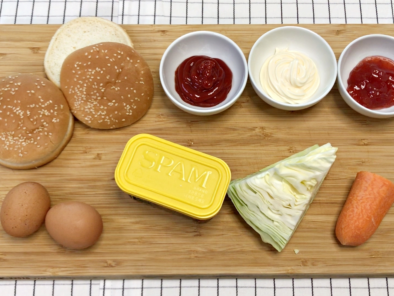 재료는 버거용 빵, 스팸, 계란, 양배추, 당근,
