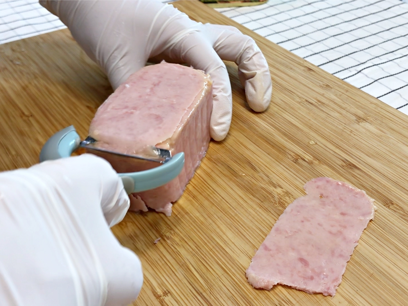 도톰한 스팸의 식감을 좋아하시면 두께감있게 썰어주세요.