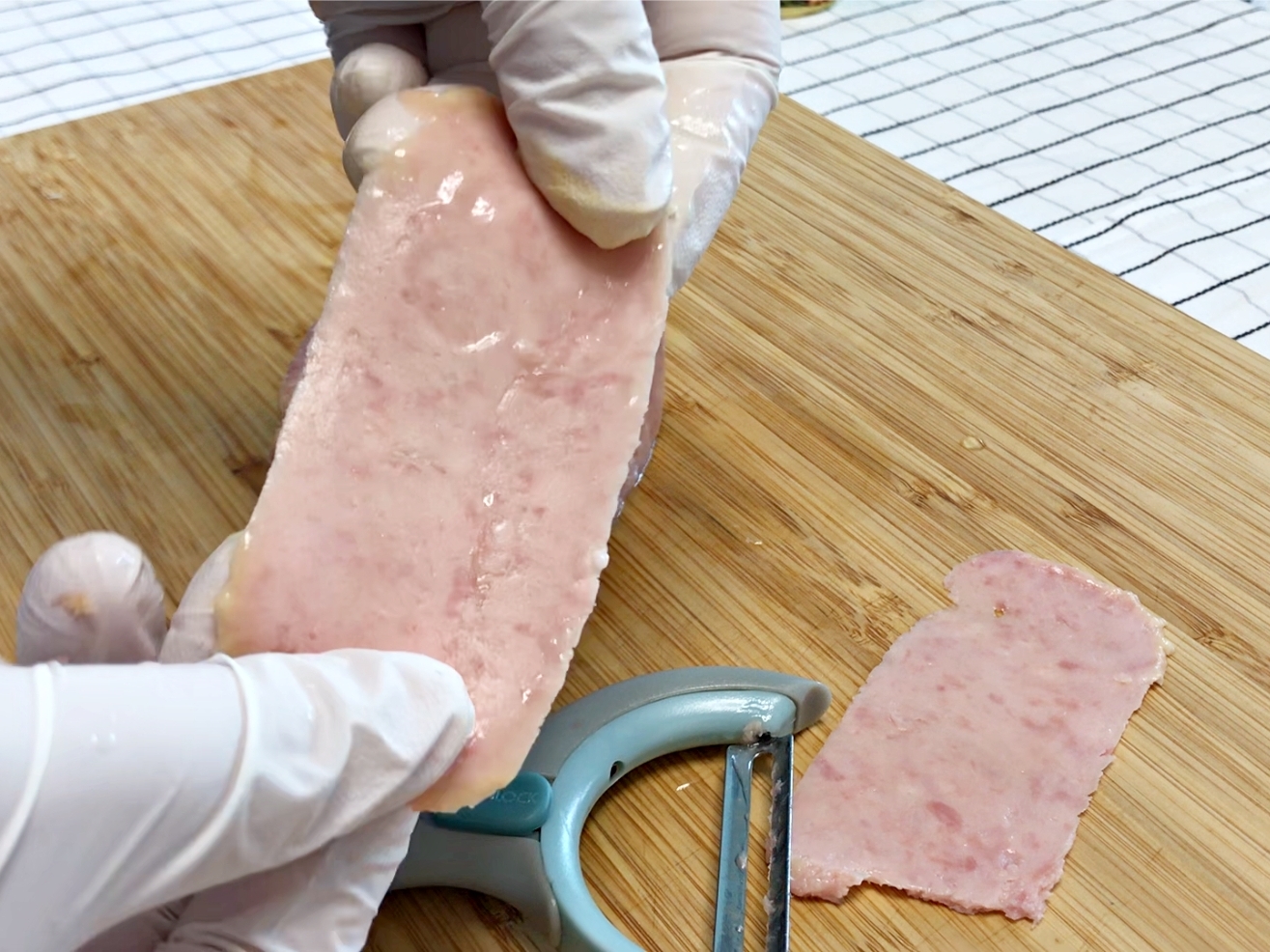 스팸을 필러로 얇게 슬라이스 해주세요.