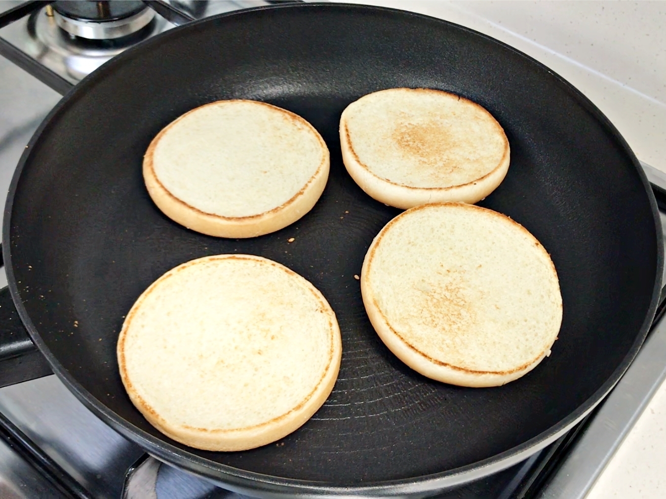 후라이팬에 버거용 빵을 노릇하게 구워주시고요.