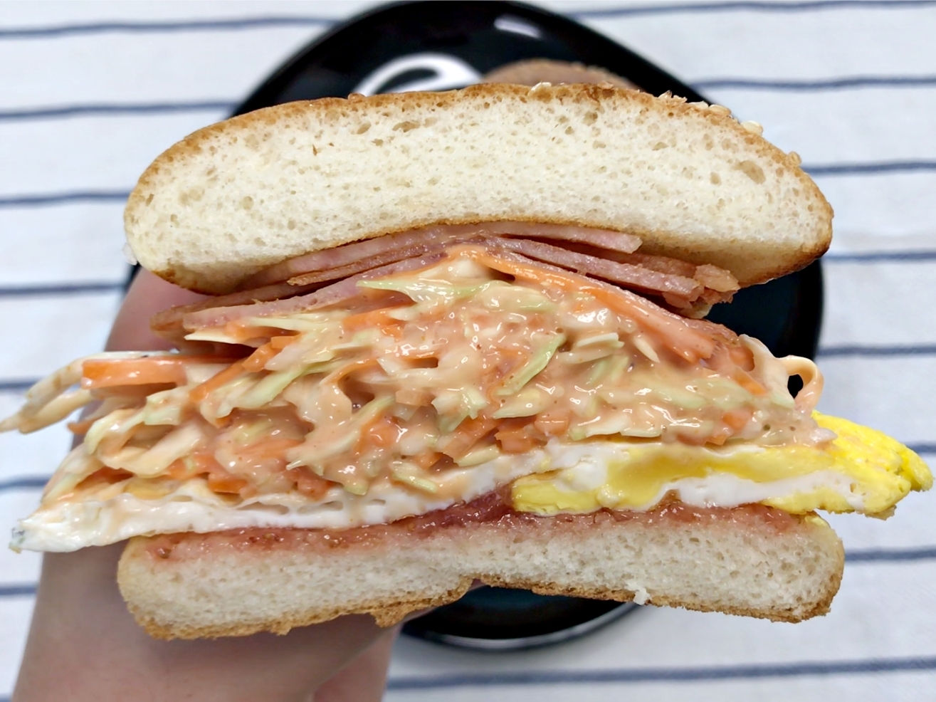 재료는 버거용 빵, 스팸, 계란, 양배추, 당근,