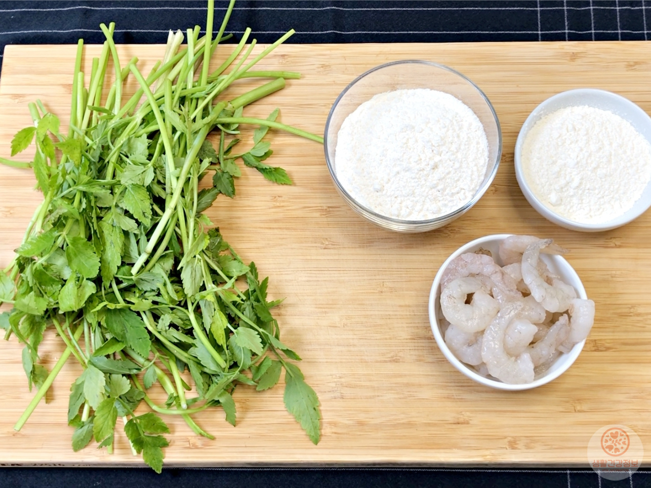 재료는 미나리, 새우, 밀가루, 튀김가루 준비해 주세요.