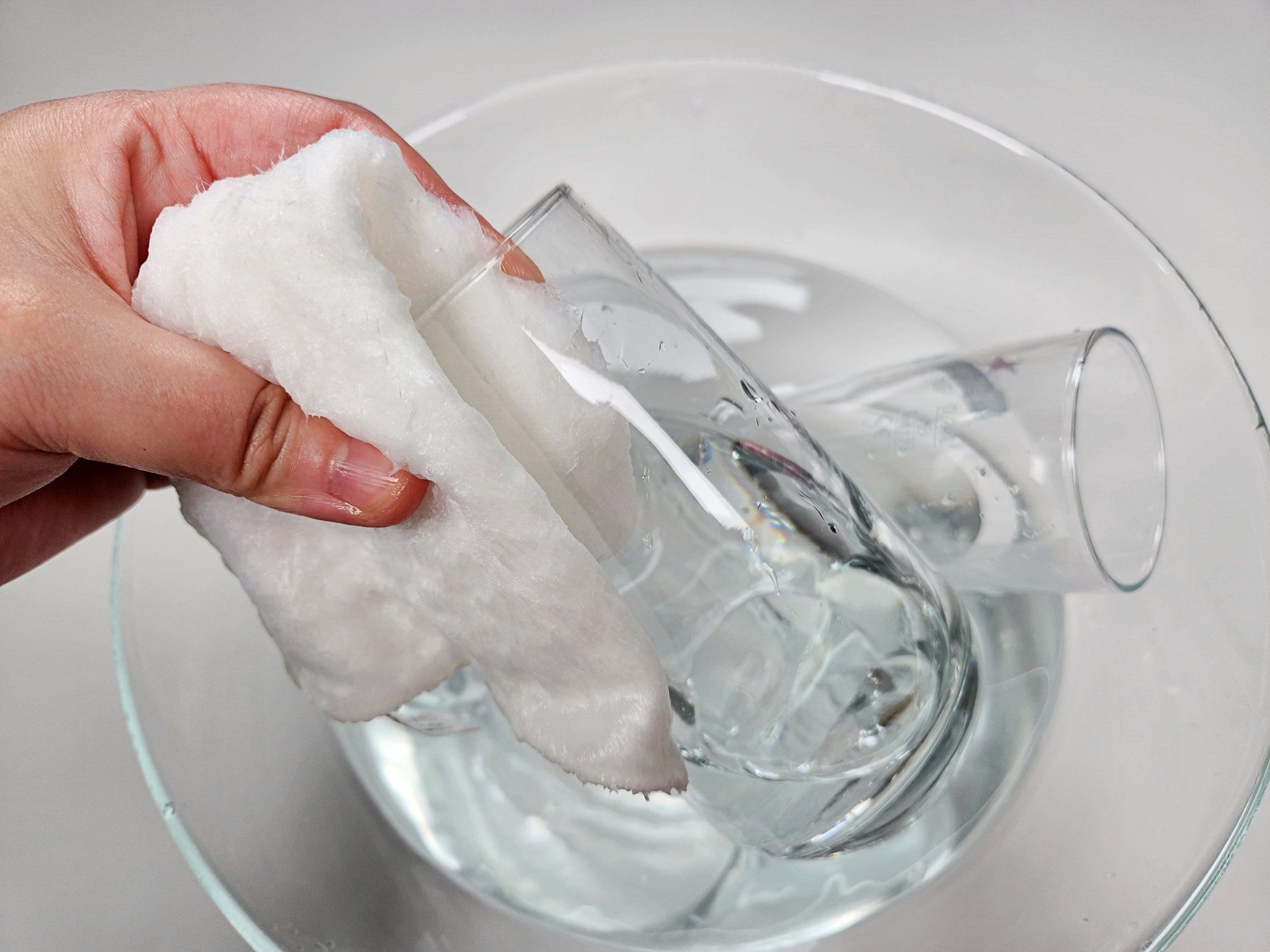 여기에 유리컵을 잠시 담가 두고요.
