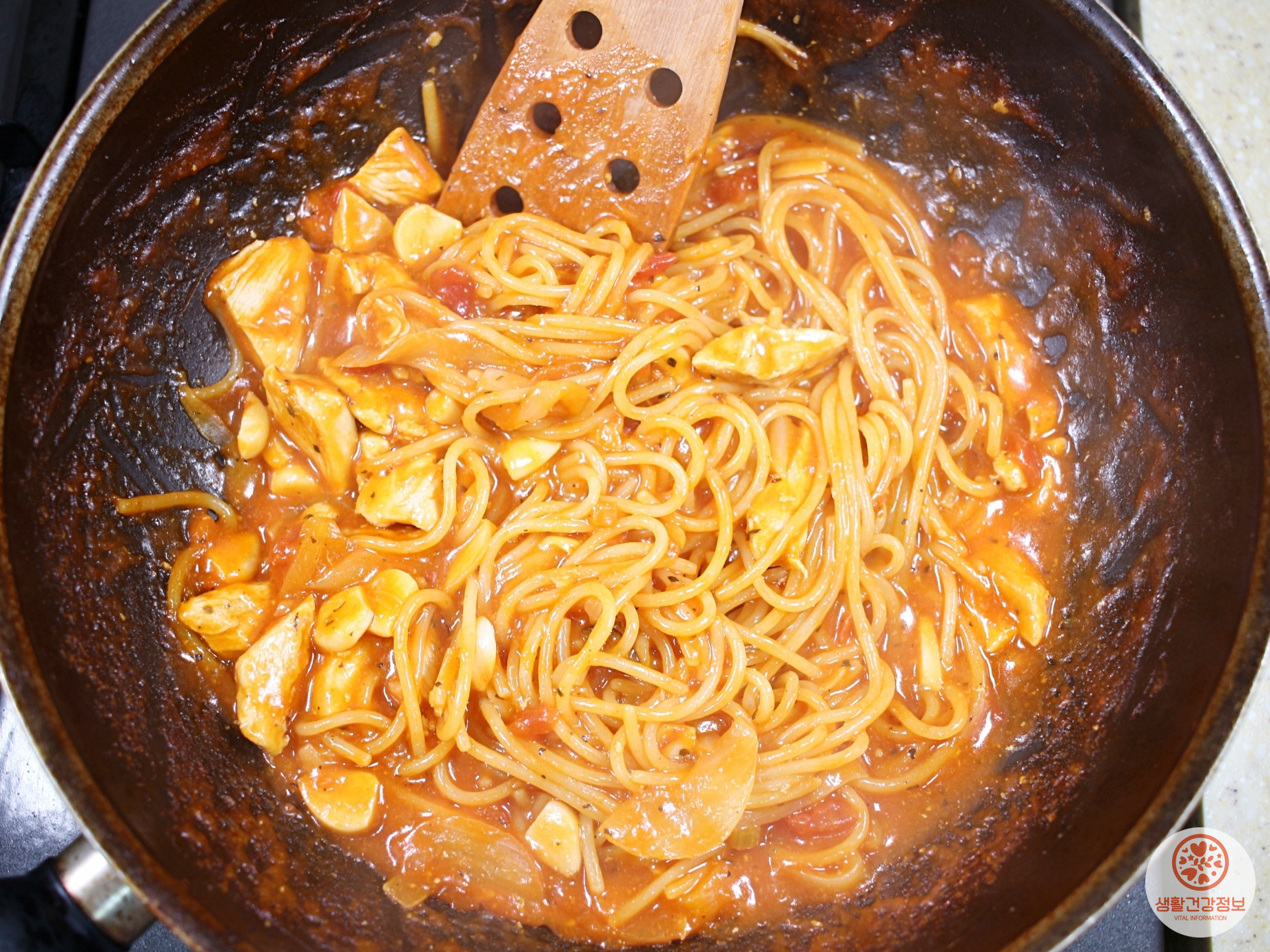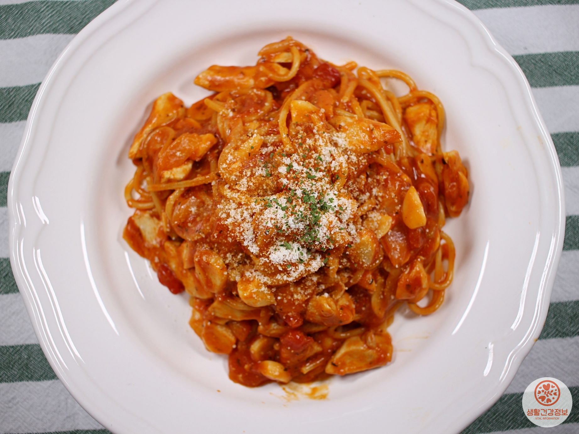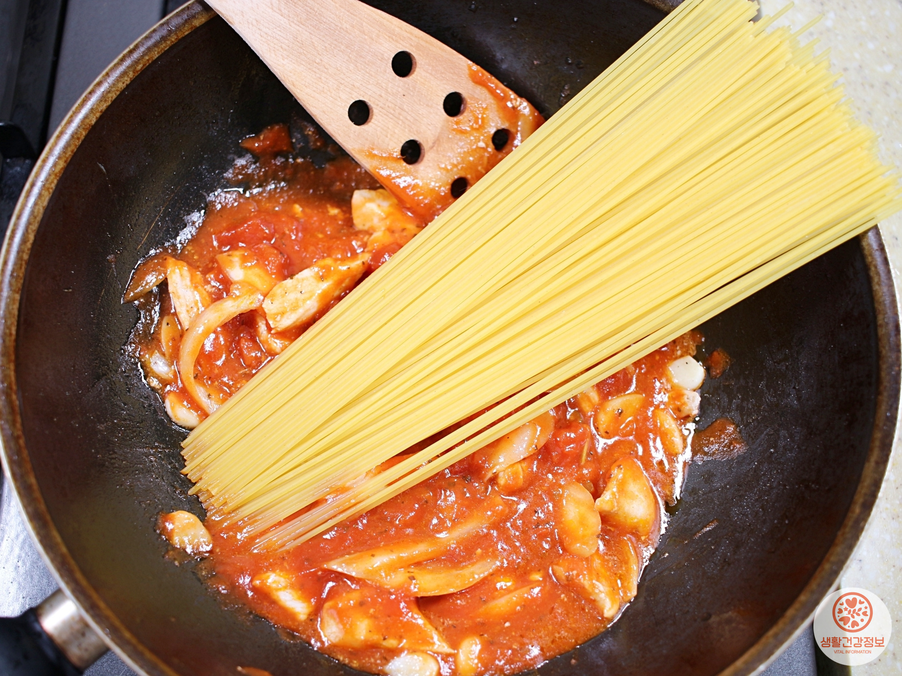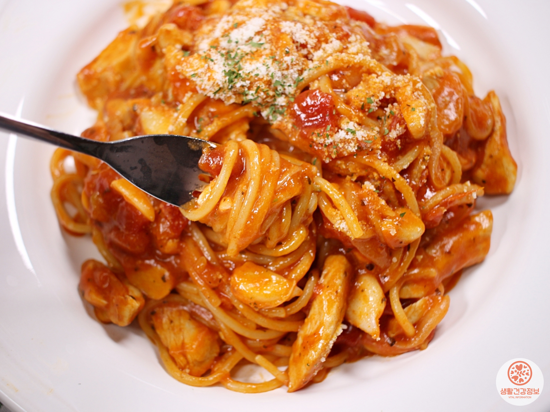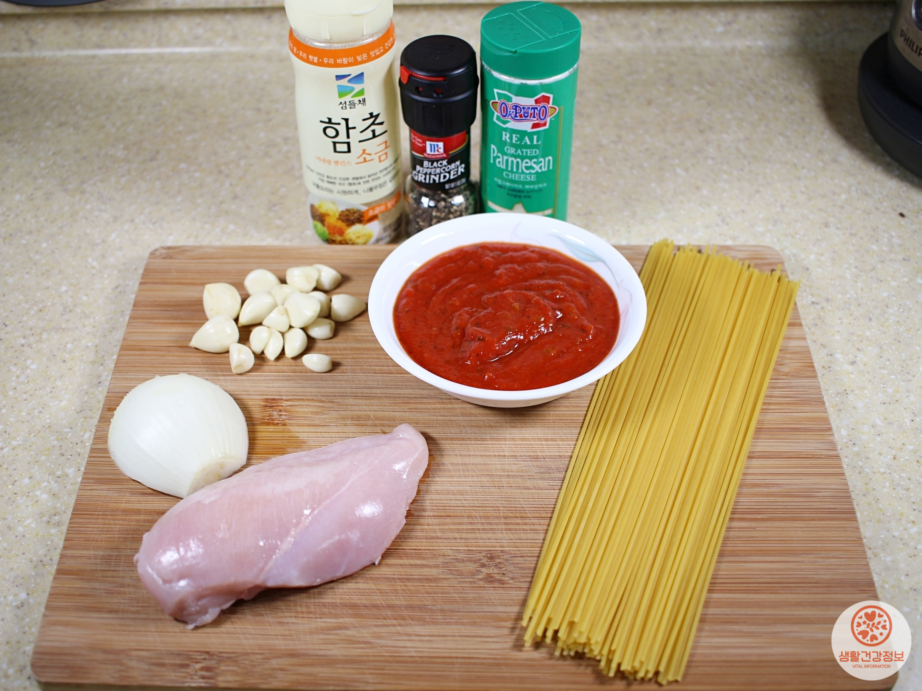 재료는 파스타면, 토마토소스, 닭가슴살, 양파,