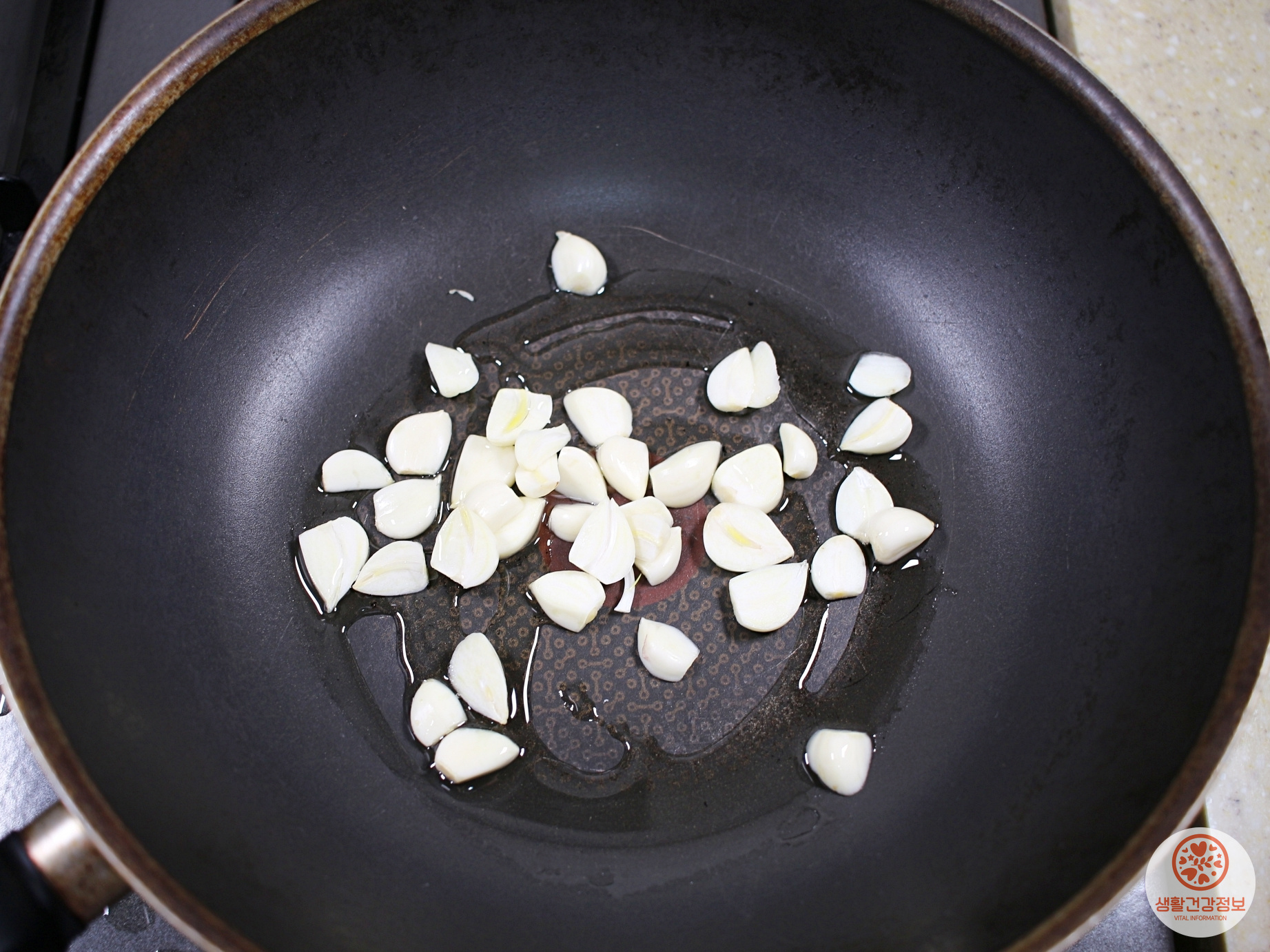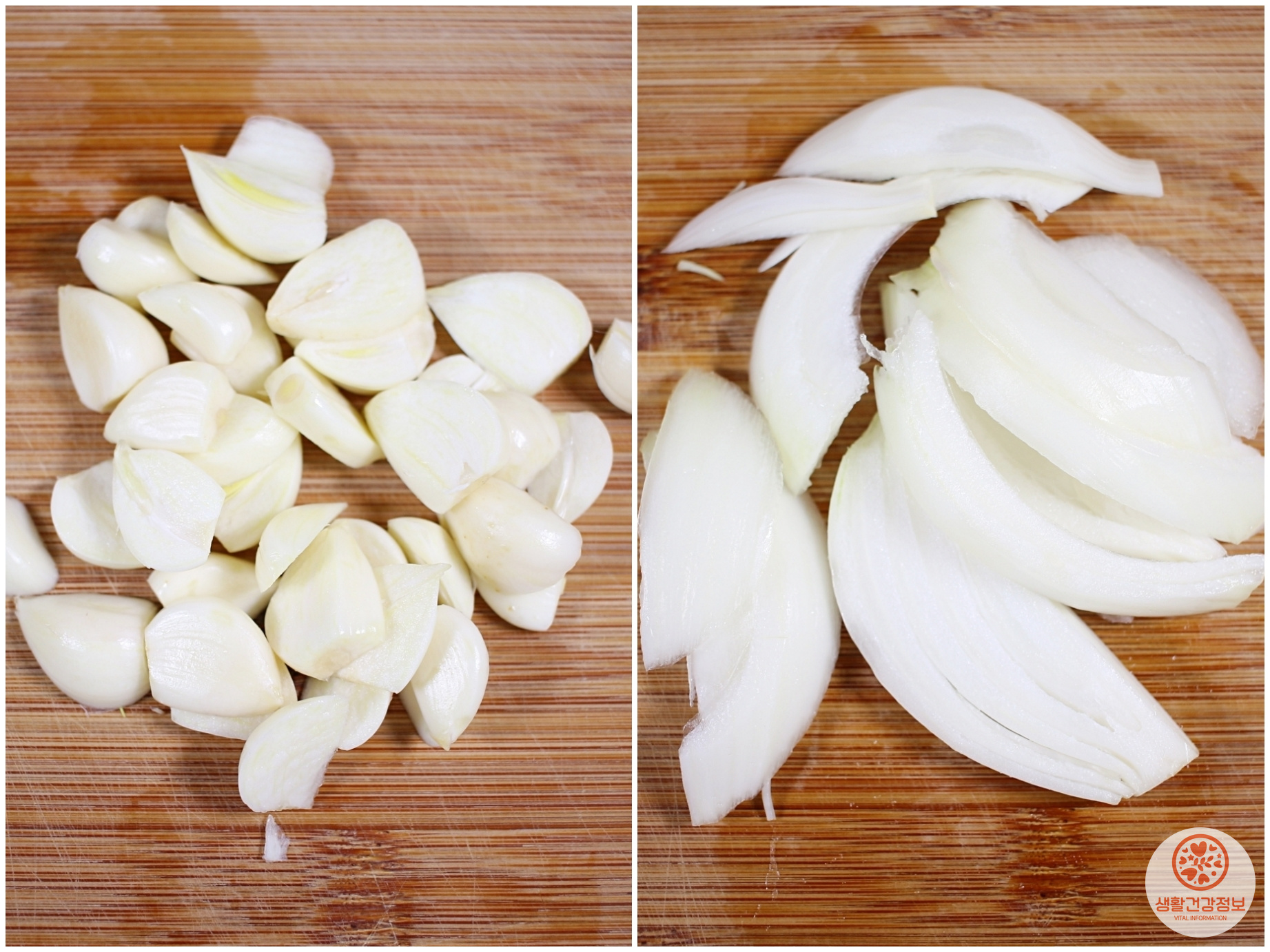 마늘 슬라이스하고, 양파도 채 썰어주세요.
