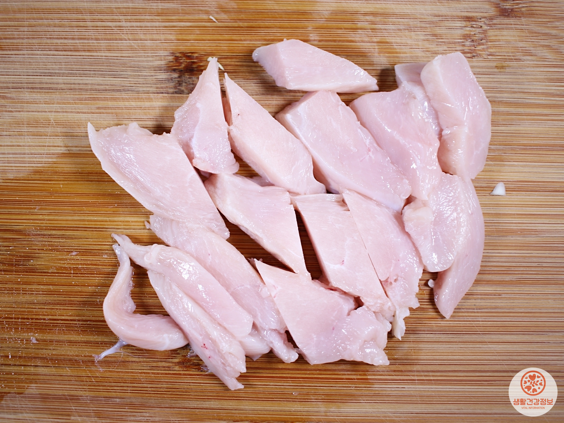 닭가슴살은 먹기 좋은 크기로 썰어요.