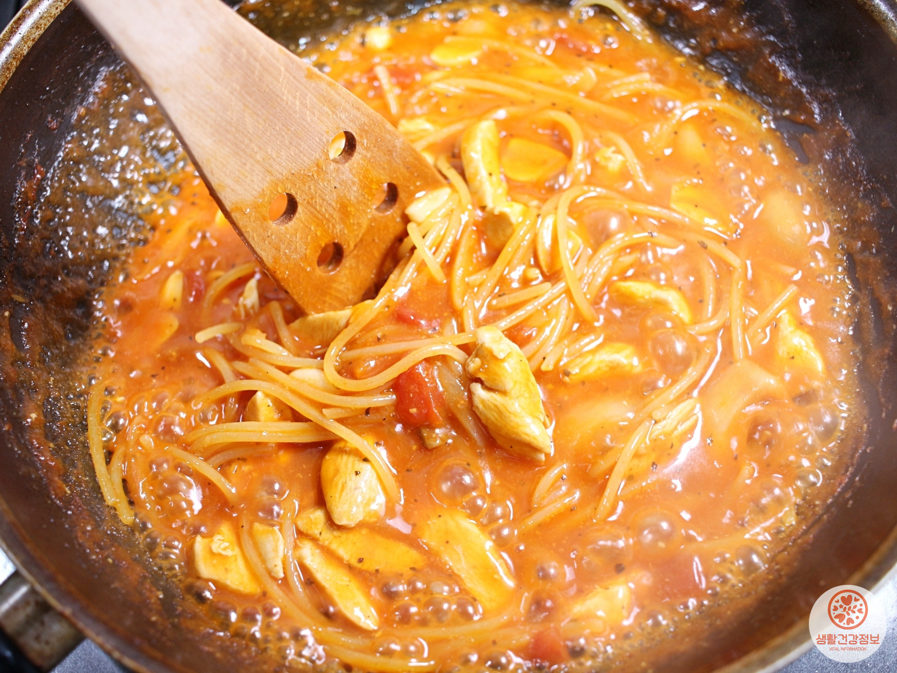 재료는 파스타면, 토마토소스, 닭가슴살, 양파,