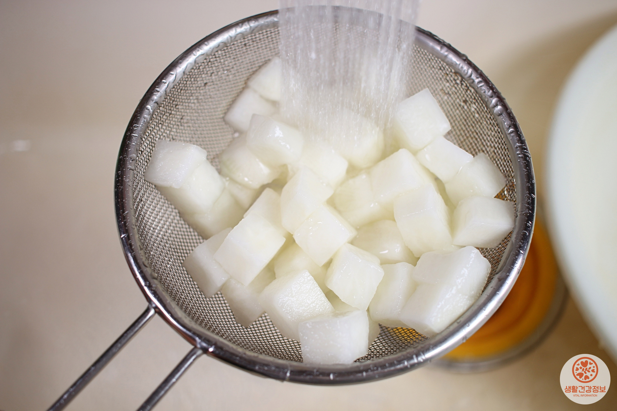 치킨무는 흐르는 물로 헹궈서 물기를 빼주세요.
