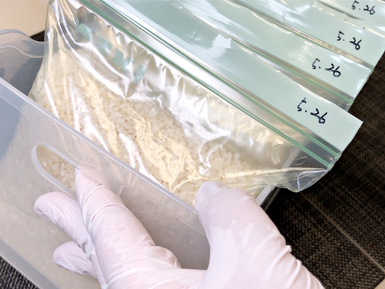 작은 사이즈 지퍼백에 쌀을 소분해서 담고요.