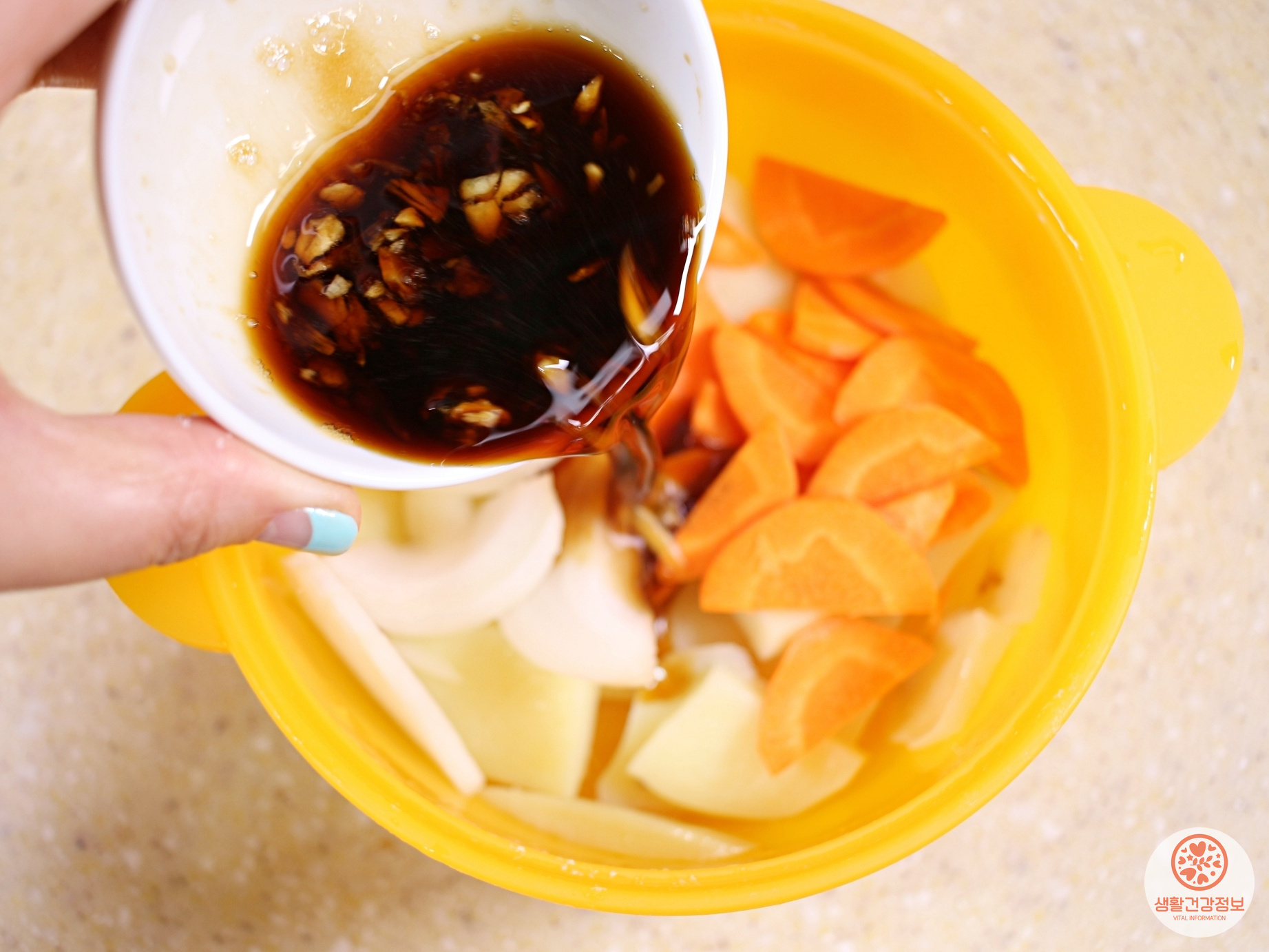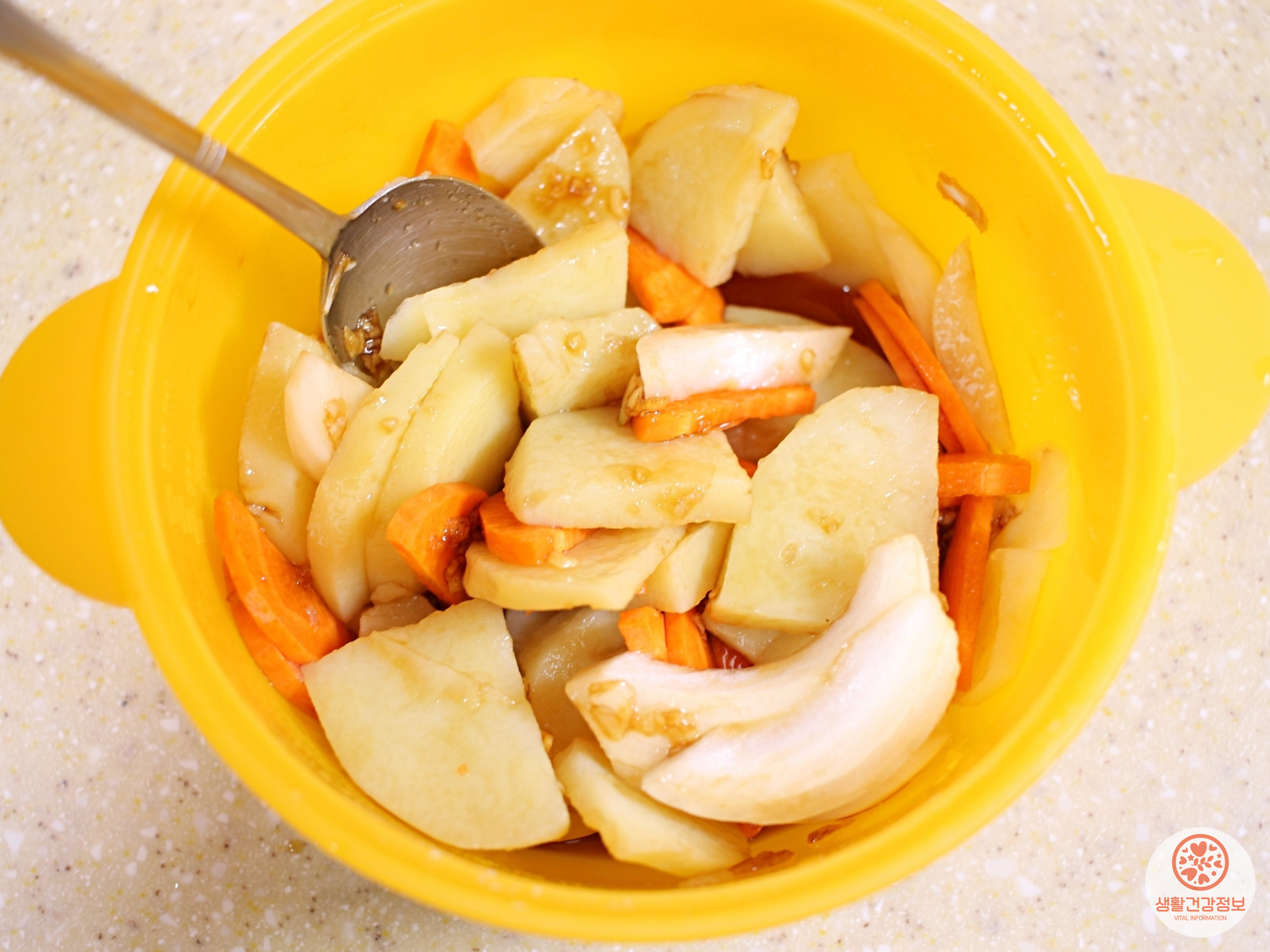 감자가 부서지지 않게 양념장 골고루 섞고
