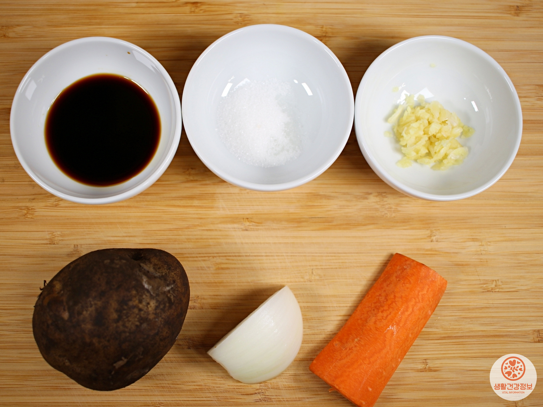 재료는 감자, 양파, 당근, 간장, 설탕, 다진마늘 준비해요.