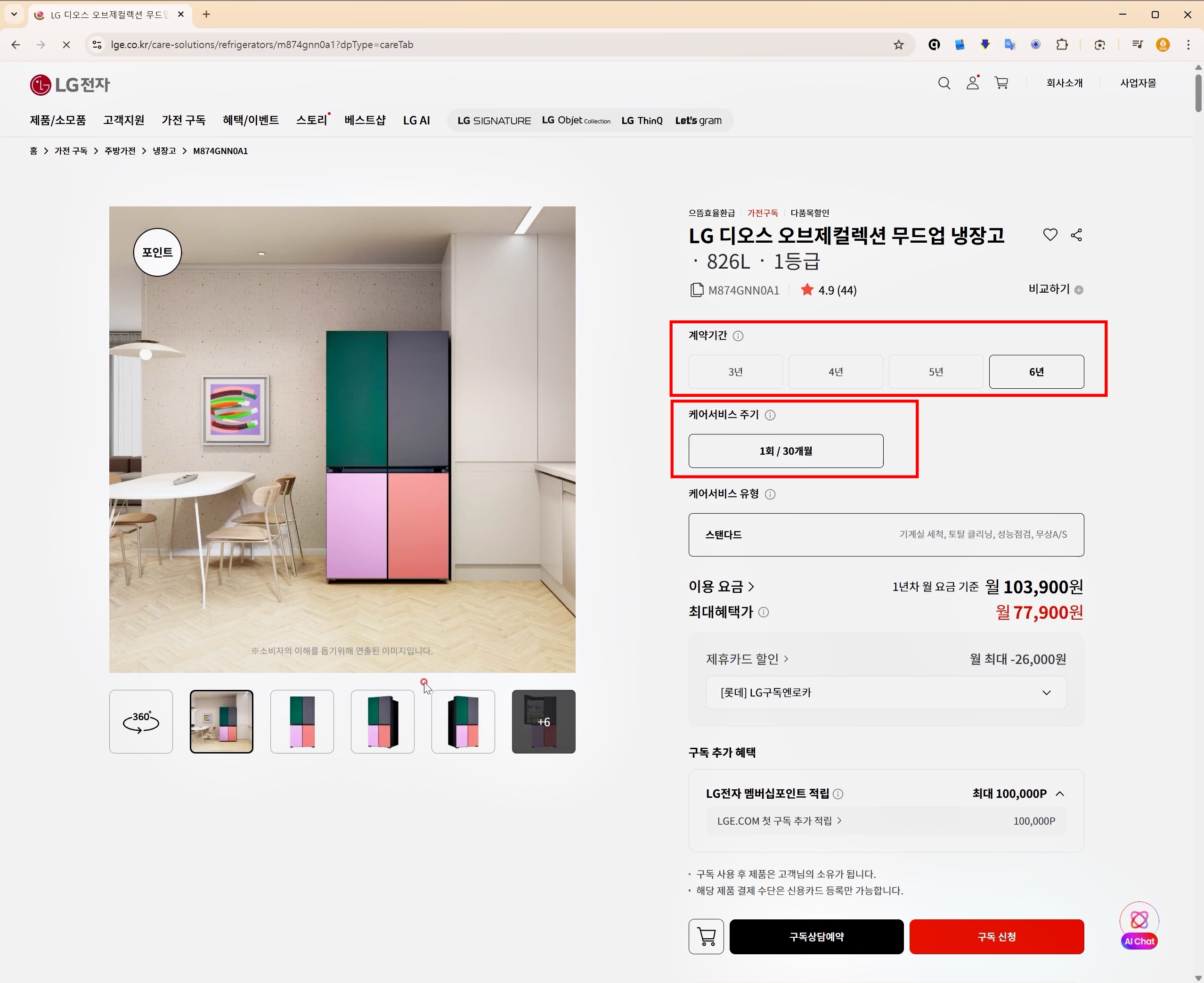 * 가전 구독 제품의 계약기간 및 의무사용기간은 최초 계약시 선택하는 계약 조건에 따라 달라집니다.