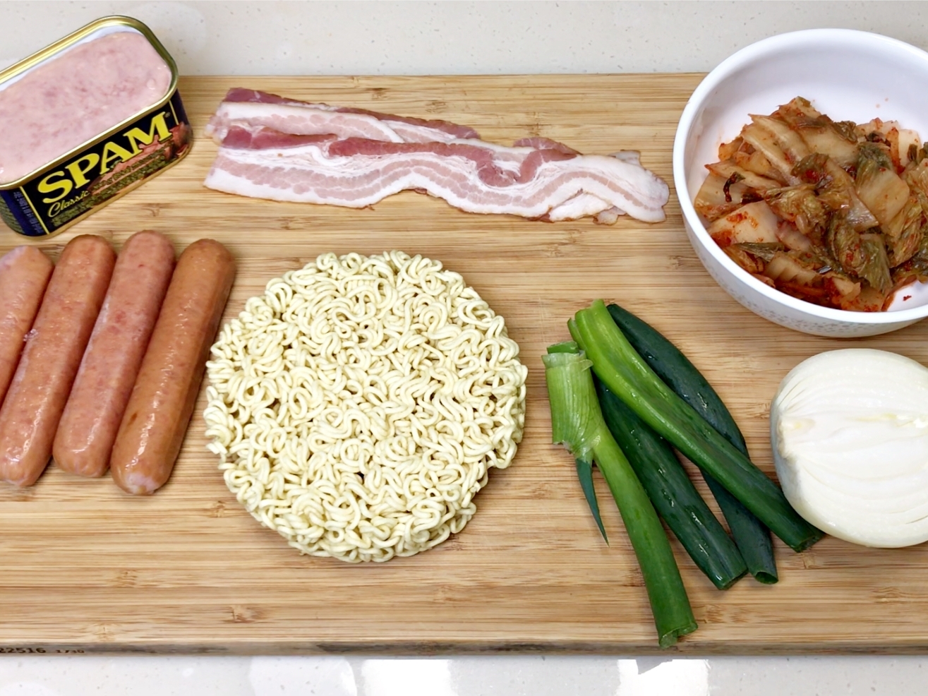 재료는 스팸, 소시지, 베이컨, 라면사리,
