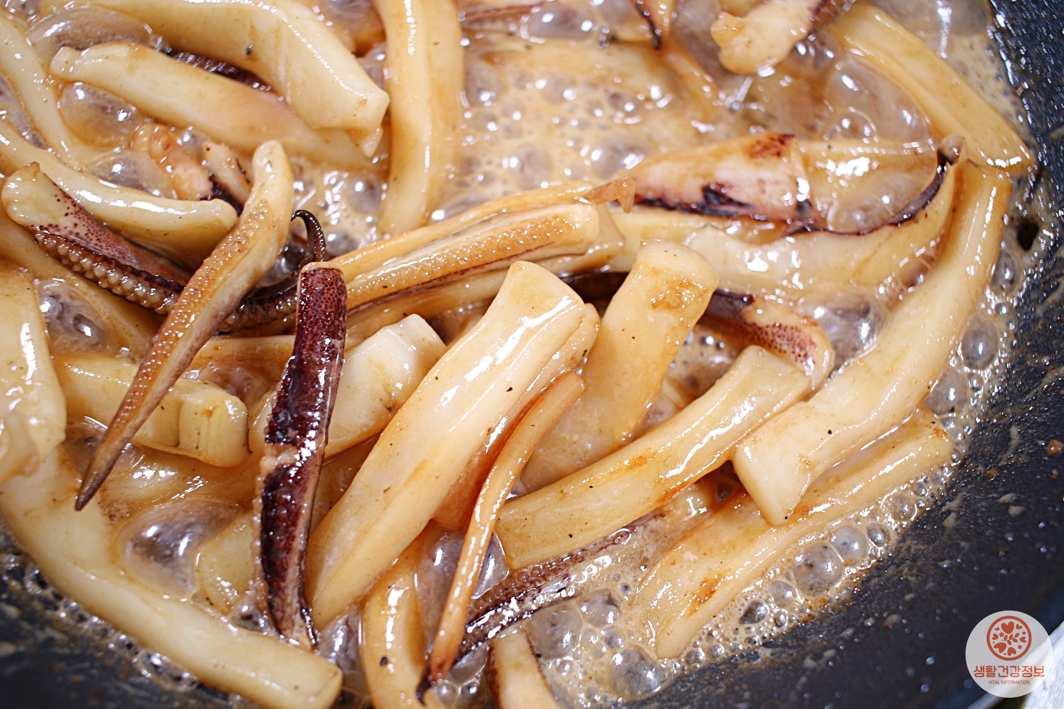 오징어를 오래 볶으면 식감이 질겨지니까요.