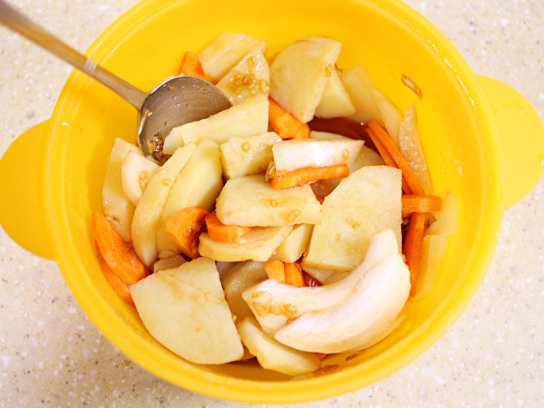 재료는 감자, 양파, 당근, 간장, 설탕, 다진마늘 준비했어요.