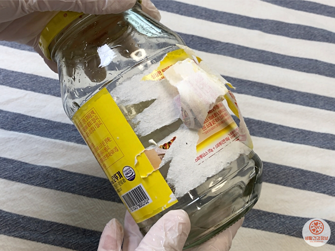 유리병을 따뜻한 물에 담가서 라벨을 불리고