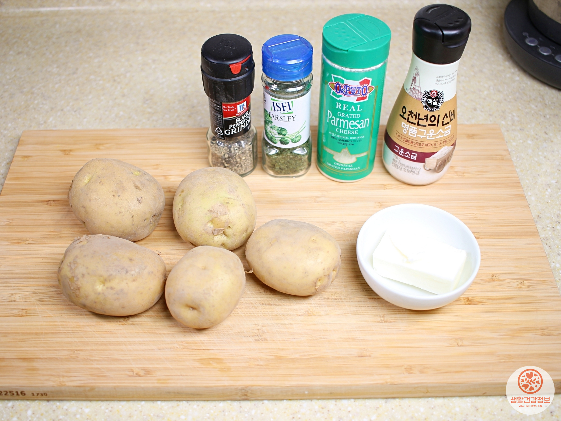 재료는 감자, 버터, 소금, 후추, 파마산치즈가루 준비했어요.