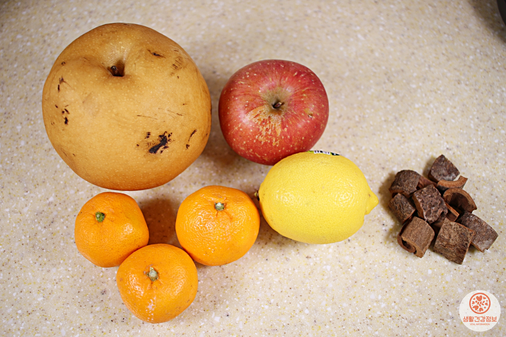 재료는 레드와인, 사과, 배, 귤, 레몬, 계피 준비했어요.