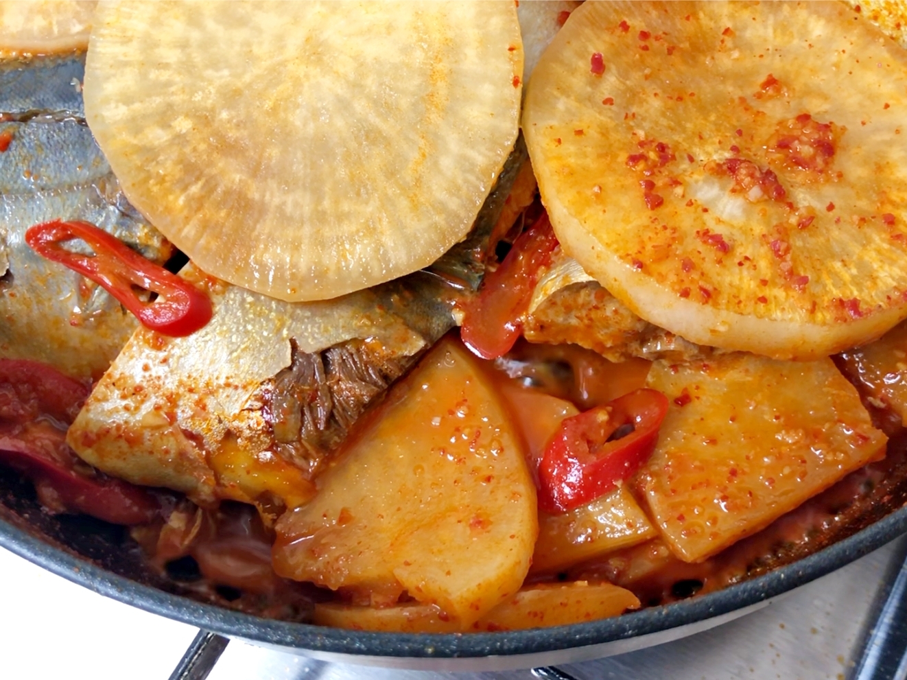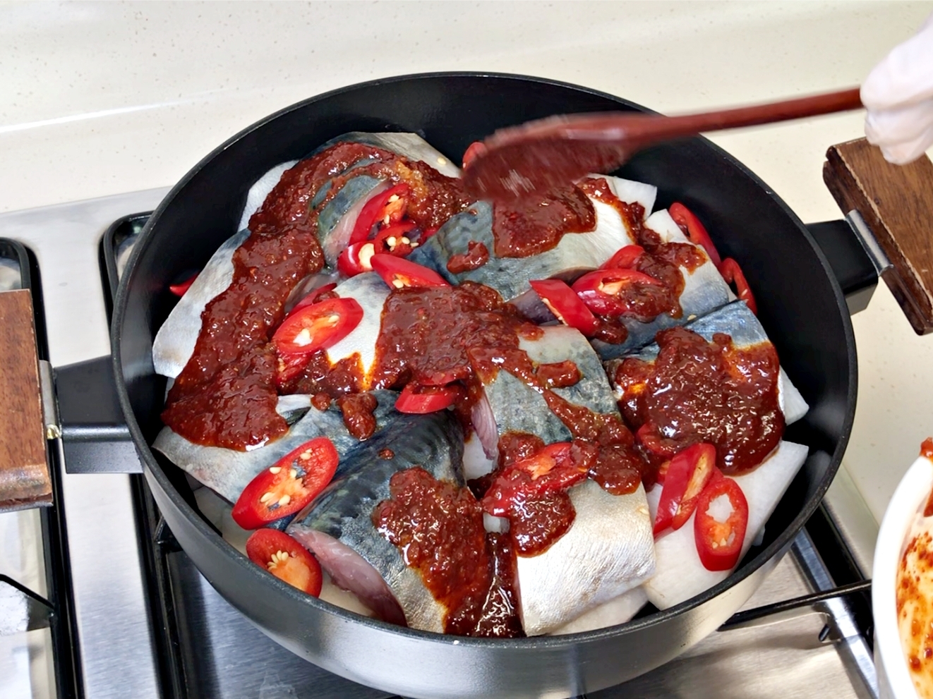 그 위에 고등어랑 홍고추를 올려주세요.