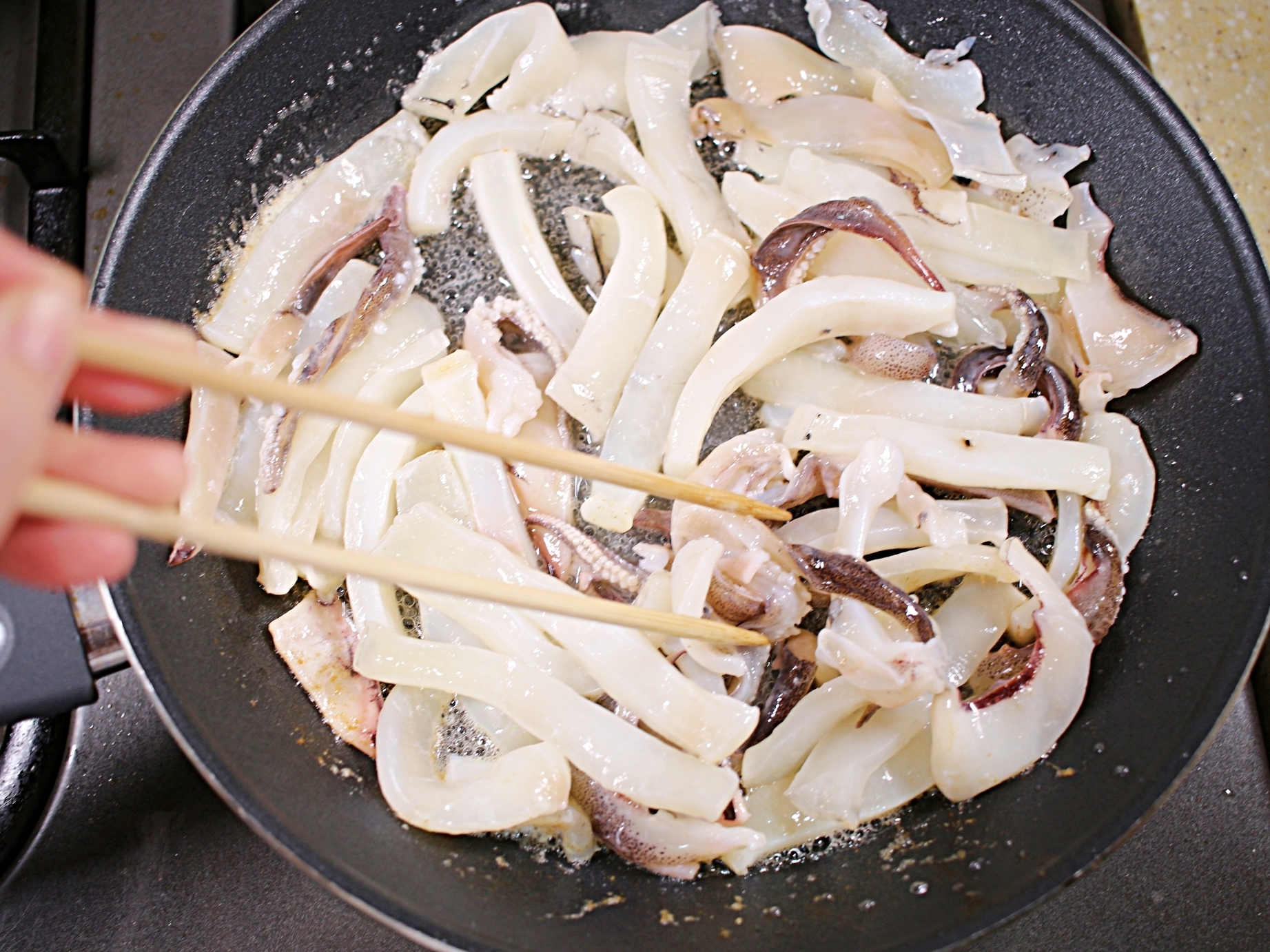 오징어가 절반 정도 익으면 소금, 후추로 살짝만 간을 해요.