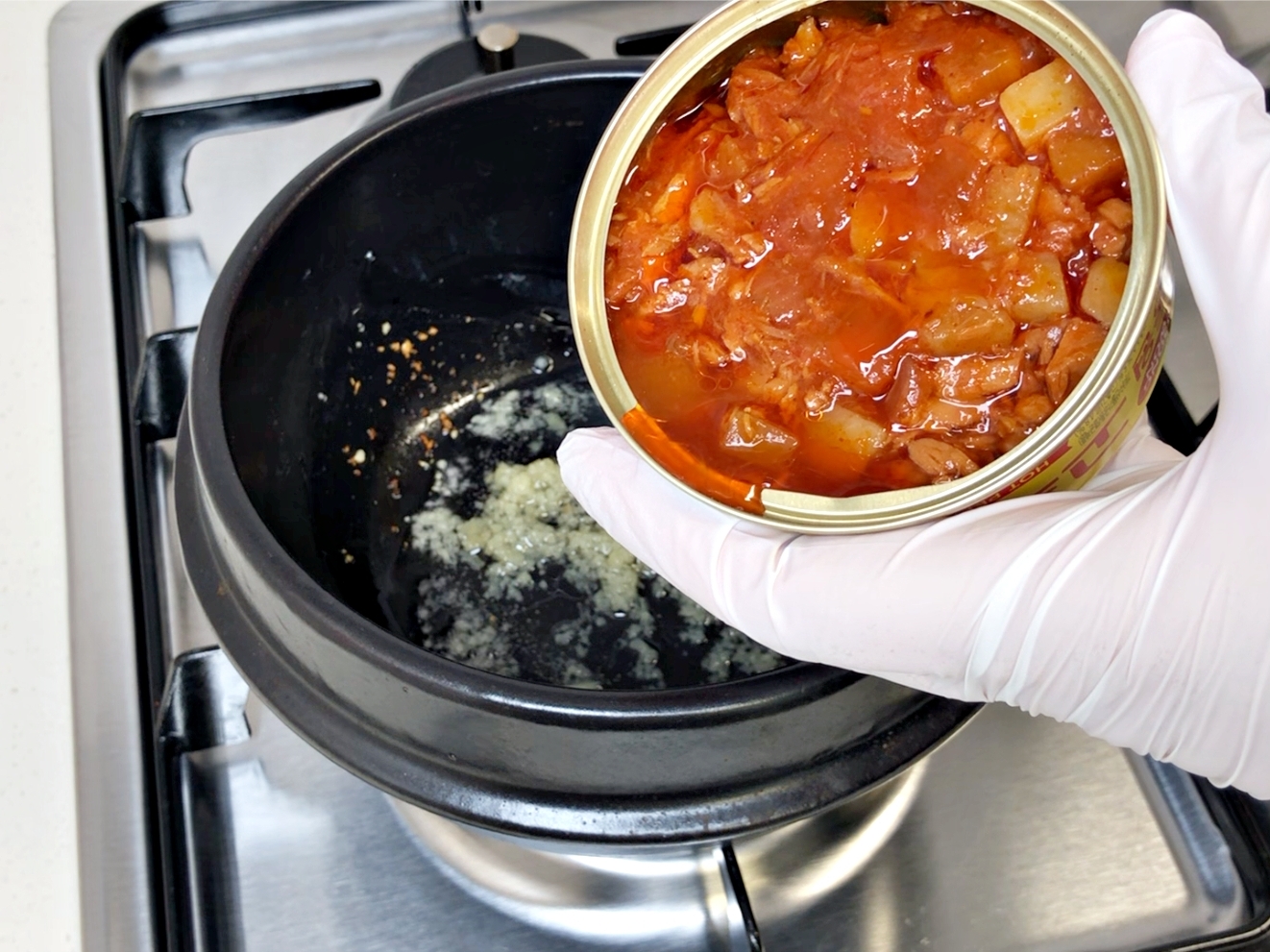 볶음 고추참치에 물 한컵을 붓고 끓여주세요.