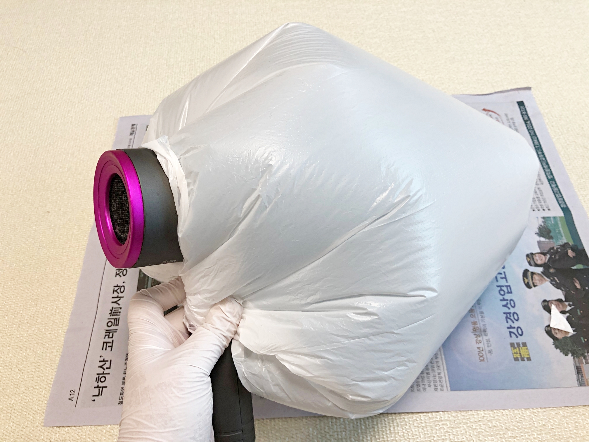 한쪽 끝에 구멍 뚫린 비닐봉지에 넣어
