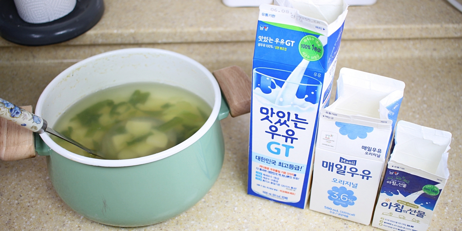 우유팩 주변에 국을 흘리지 않도록
