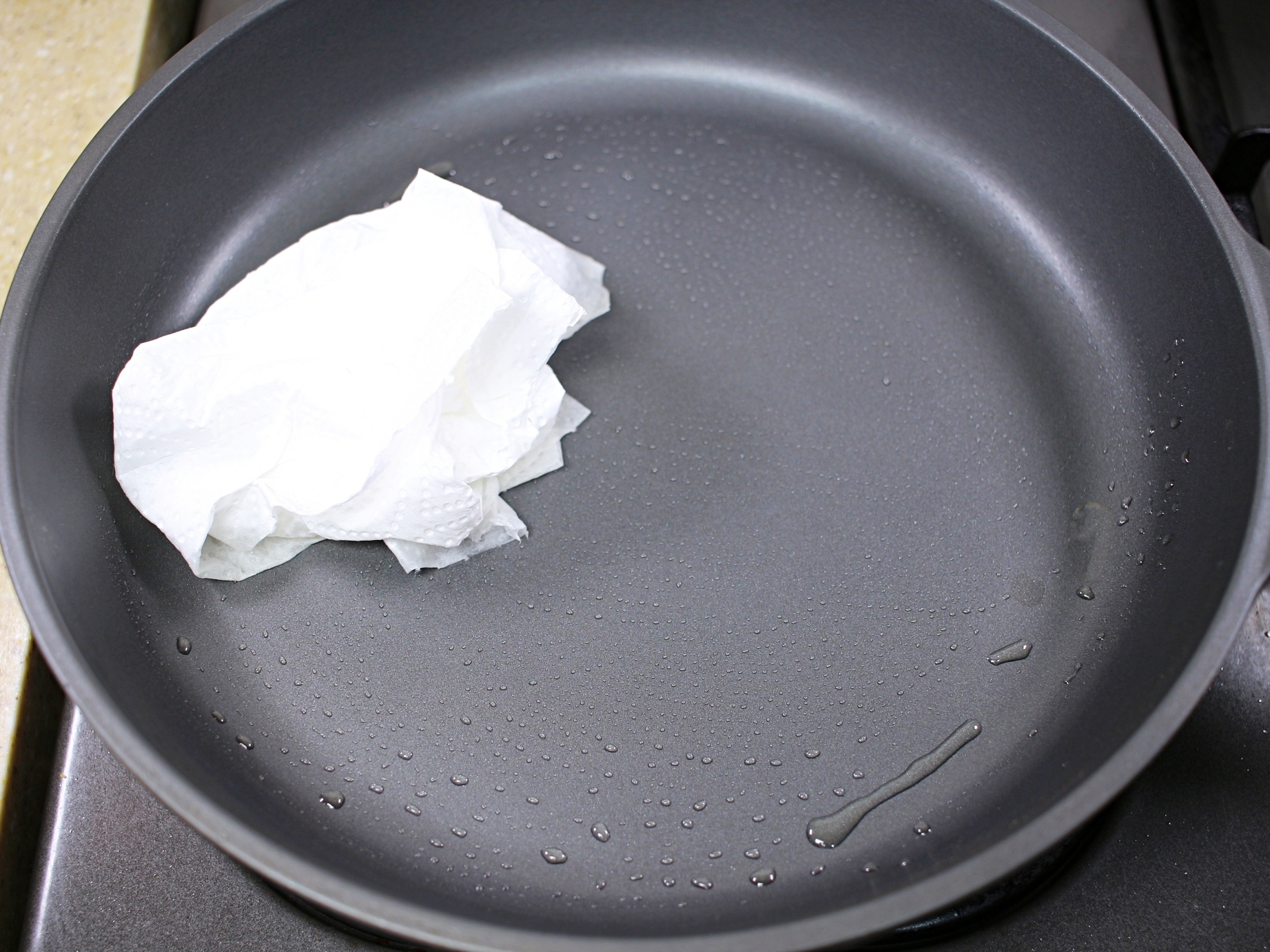 계란물 붓기 전에 키친타월로 기름기를 닦아주세요.